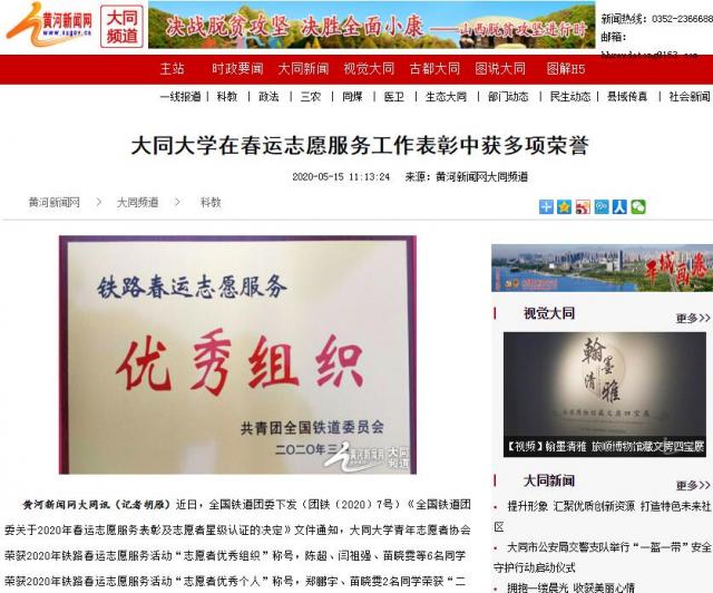 黄河新闻网大同讯(记者胡雁)近日,全国铁道团委下发(团铁〔2020〕7号)《全国铁道团委关于2020年春运志愿服务表彰及志愿者星级认证的决定》文件通知,今年会官方网站青年志愿者协会荣获2020年铁路春运志愿服务活动“志愿者优秀组织”称号,陈超、闫祖强、苗晓雯等6名同学荣获2020年铁路春运志愿服务活动“志愿者优秀个人”称号,郑鹏宇、苗晓雯2名同学荣获“二星级志愿者”称号。