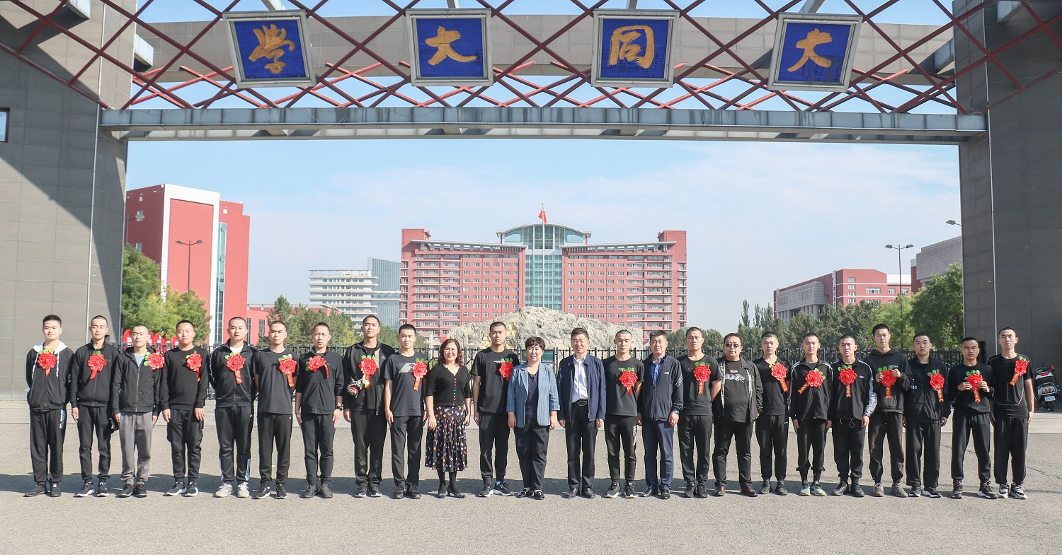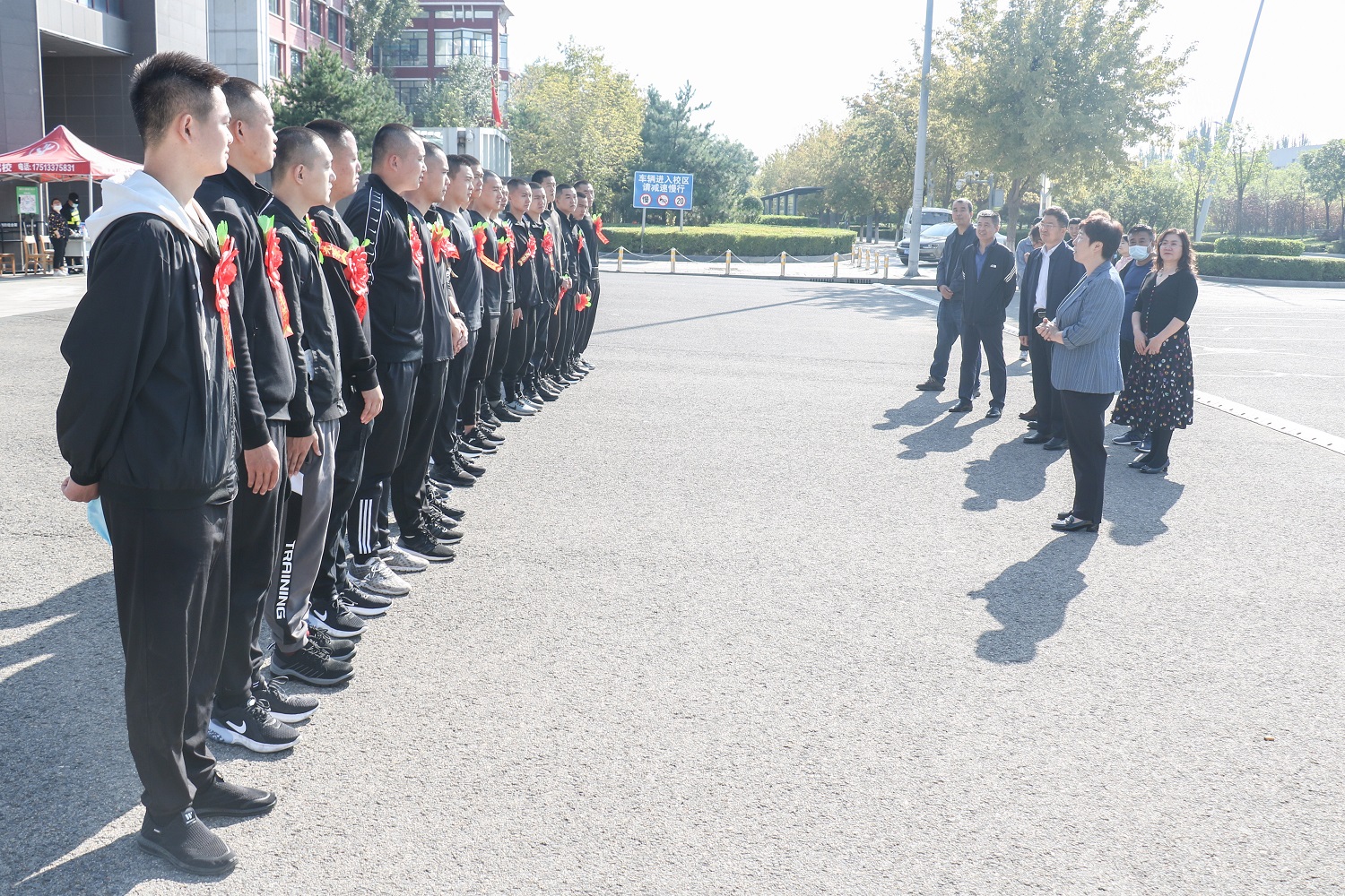 欢送仪式结束后,参会领导与入伍同学合影留念。姚丽英等领导将学生送行至前往集训基地的大巴车,并握手道别。