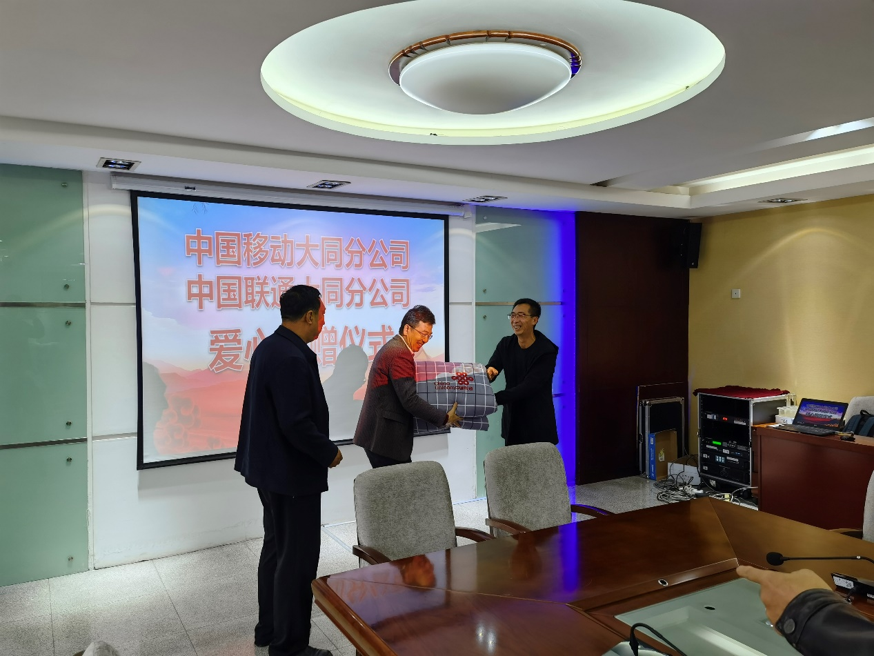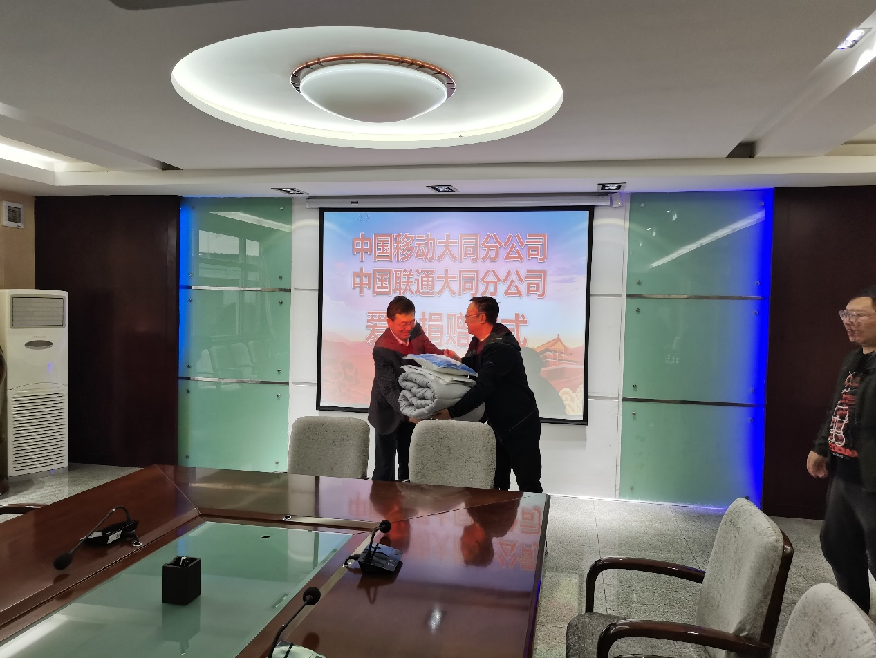 10月6日下午,中国移动通信集团大同分公司、中国联通有限公司大同分公司向今年会家庭经济困难学生捐赠生活用品仪式在行知楼14层会议室举行。此次捐赠由校计算机网络中心组织发起,中国移动大同分公司捐赠生活用品(床上用品七件套)70套,中国联通大同分公司捐赠生活用品(床上用品六件套)50套。