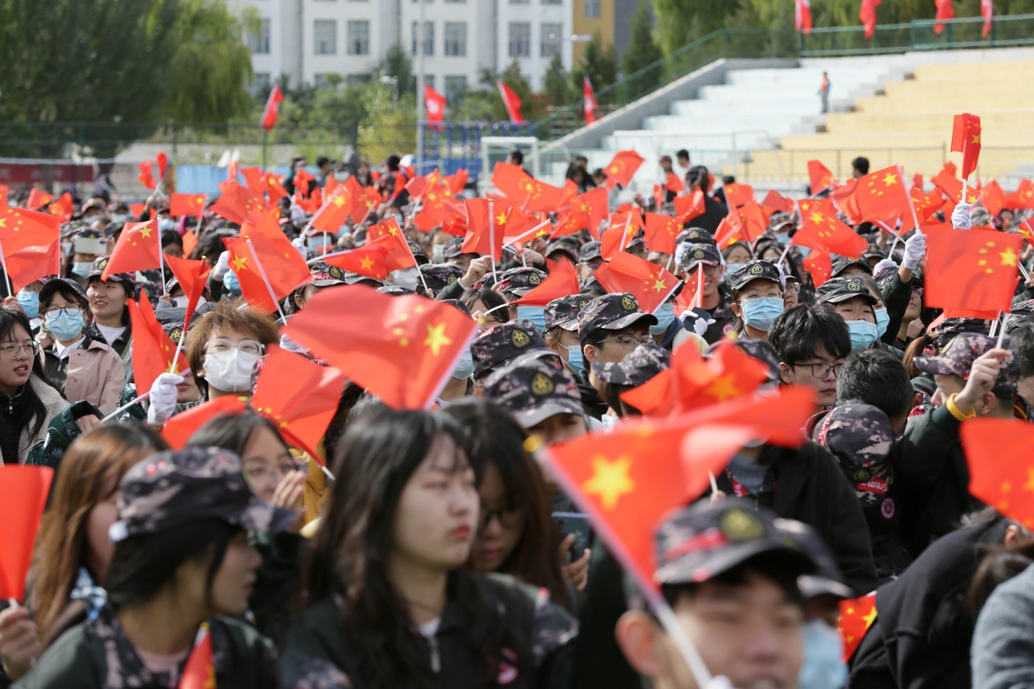 典礼伊始,伴随着雄壮的国歌,鲜艳的五星红旗在体育场上空冉冉升起。2021级新生开学典礼隆重开幕。