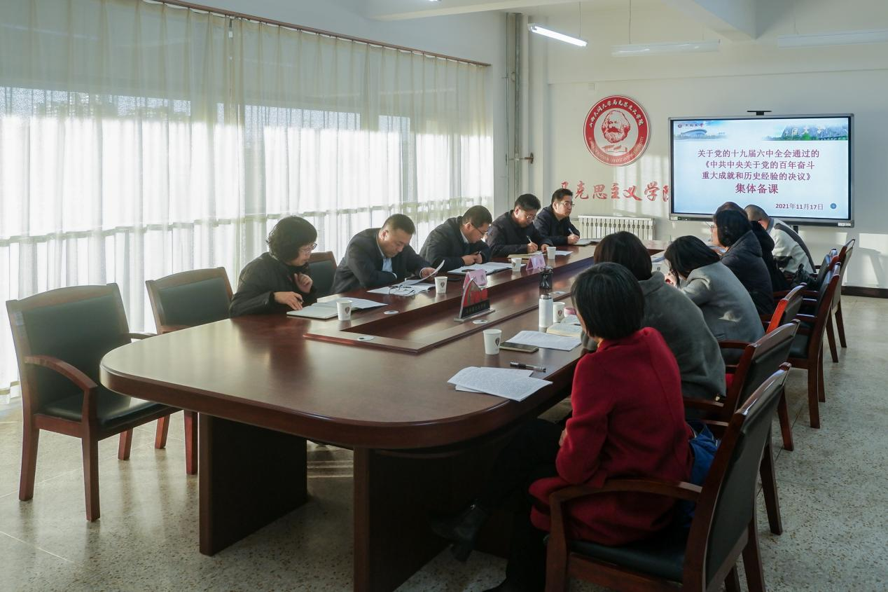 11月17日下午,马克思主义学院在本真楼C503会议室召开党的十九届六中全会精神集体备课会。校党委副书记刘洪、党委宣传部部长孙刚、马克思主义学院党委委员、教研室主任和思政课教师参加会议,学院党委书记刘殿祥教授主持会议。