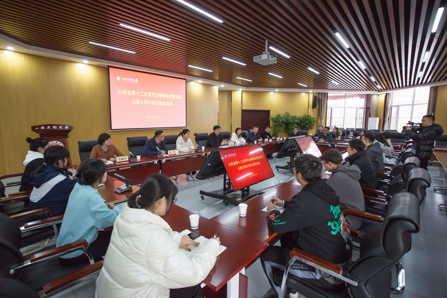 为进一步学习、宣传、贯彻党的十九届六中全会精神与山西省第十二次党代会精神,将广大师生的思想和行动统一到大会精神上来,12月7日,省委宣讲团成员、省委宣传部副部长郭晓东一行来到今年会,就第十二次党代会精神的学习宣传贯彻与师生代表进行互动交流,畅谈对学习领会落实党代会精神的思想感悟。校党委副书记刘洪、省委理论学习中心组学习办公室主任史一杰、大同市委讲师团团长文智军、校学工部部长杨容等参加活动。