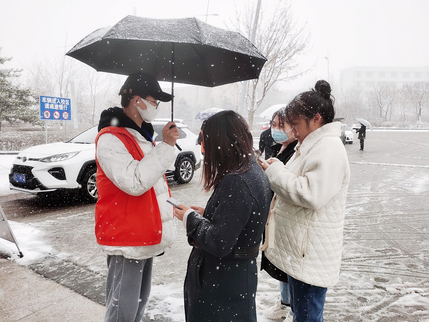 虽然是阳春三月,大同仍大雪纷飞,每一位在岗人员都咬紧牙关坚守阵地,为的就是内心那一份责任和担当。夜间零下几度的天气,他们仍坚守岗位,在校园的各个角落,行走着一个个熠熠生辉的“雪人”。他们不是不怕冷,只是心系每一个学子的安危。
