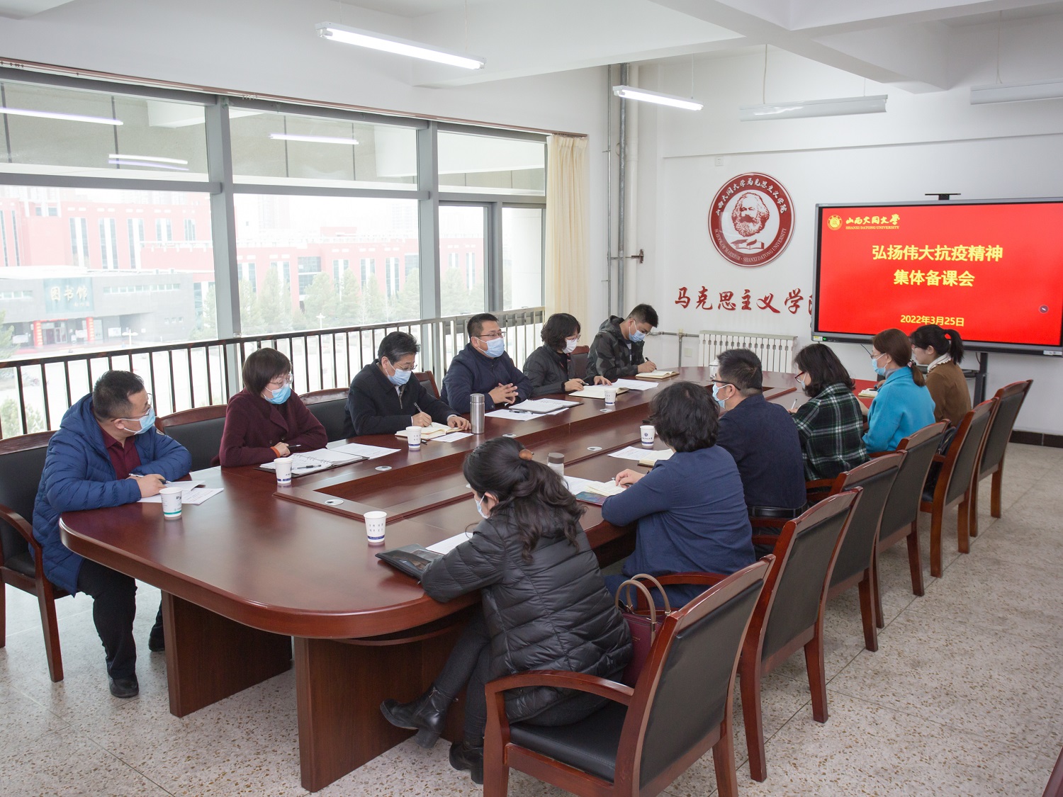 孙刚就进一步完善备课内容,上好抗疫精神思政大课,提出意见建议,一是备课要全程以习近平新时代中国特色社会主义思想为指导,将大力弘扬伟大抗疫精神作为铸魂育人的重要抓手,激励广大师生“同”心抗疫的使命担当;二是要加强宣传力度,紧密结合学校疫情防控工作实际,有效解读各项防控措施,讲好同大抗疫故事,凝聚筑牢校园安全防线强大合力。