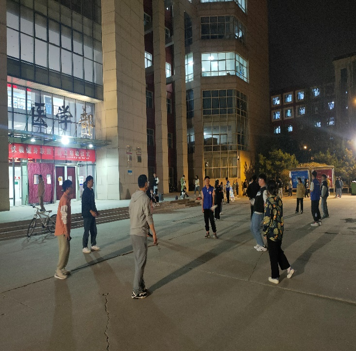 医学院大厅门外,新安装的五盏耀眼的射灯照亮了广场。同学们在广场上伴随着灯光,在美妙轻快的音乐声中,围着圈快乐的踢毽子,跳大绳,这是医学部与体育学院创立的“伏羲健身联盟”第二课堂。明亮的灯光为学生带来了欢乐和健康,推动了学院特色体育的发展,促进了学生身心健康。楼内楼外灯光相映成趣,动静结合,为同学们带来了活力和温暖。