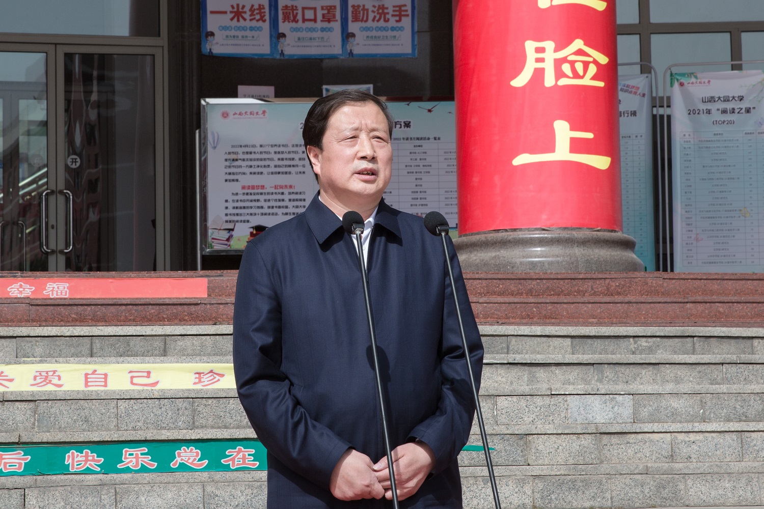 弓永华作讲话。他表示,同大的“第二课堂”时下正如火如荼地开展,成为提升校园文化品位、丰富校园文化生活、创新人才培养模式的主渠道、主课堂。朗朗的读书声、运动的喝彩声、动听的歌声遍布校园的每个角落,展示着同大人朝气蓬勃的精神风貌和健康高雅的生活追求。书籍是人生的精神财富,是人类进步的阶梯,读书可以使人总览古今中外,启迪心灵和智慧。只有通过读书,才能成就人生,才能修身养性,才能获得人生的幸福。关于读书,他深情勉励全校师生:要常读书,养成终身读书的习惯。把读书作为一种精神追求和生活方式,让读书成为勇于挑战、摆脱困境的精神源泉,成为提升自我、战胜自我的有效途径。要读好书,感受深层次的阅读体验。在网络信息时代,要学会跳出漫无目的的浅阅读,进入思想层面、道德层面的深层次阅读,通过不断地阅读古今中外经典,启迪智慧、拓展视野、净化心灵。要善读书,追求知行合一的境界。“纸上得来终觉浅,绝知此事要躬行”,学习的目的是为了应用,不读死书、不死读书,在读书中坚持学思践悟,在实践中追求知行合一。要以书为伴,读出人生真谛,要以史为鉴,塑造精彩人生,为同大高质量发展贡献智慧与力量。