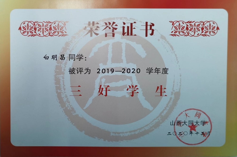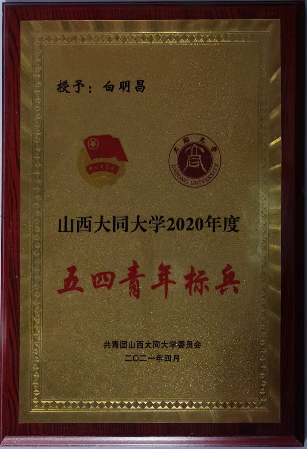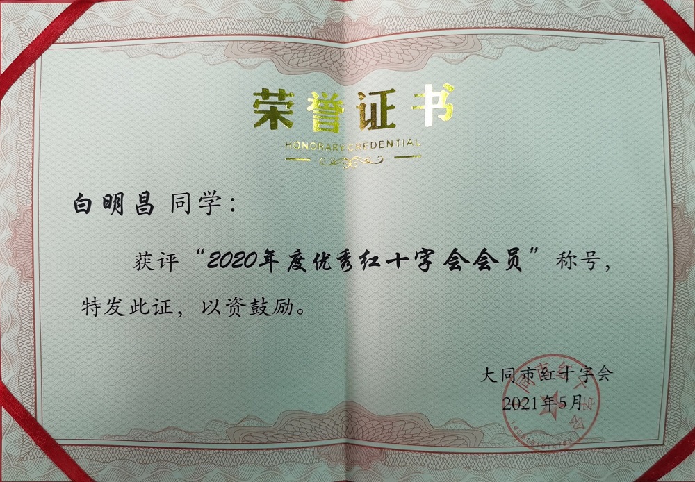 因工作表现突出,白明昌同学被表彰为2019年度优秀学生干部、jinnianhui今年会2020年度五四青年标兵、大同市红十字会2020年度优秀红十字会会员。