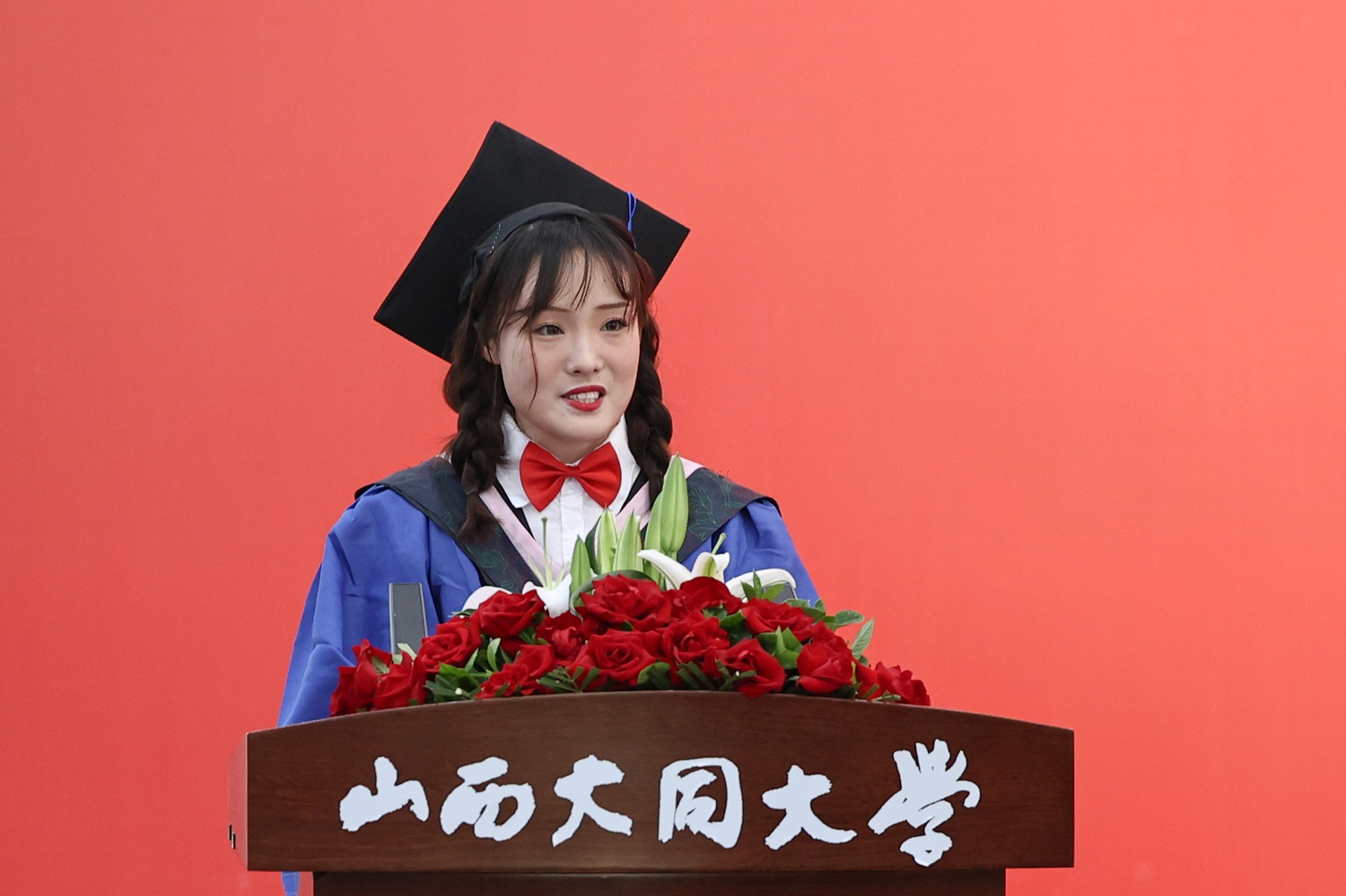 优秀研究生代表、中国语言文学专业硕士研究生刘芳同学代表全体毕业研究生真诚感谢母校的精心栽培,发出“同大强音”:凝聚智慧、胸怀大志、脚踏实地,追寻“大同”梦想,实现远大抱负,用青春的智慧和汗水打拼出一个更加美好的中国!
