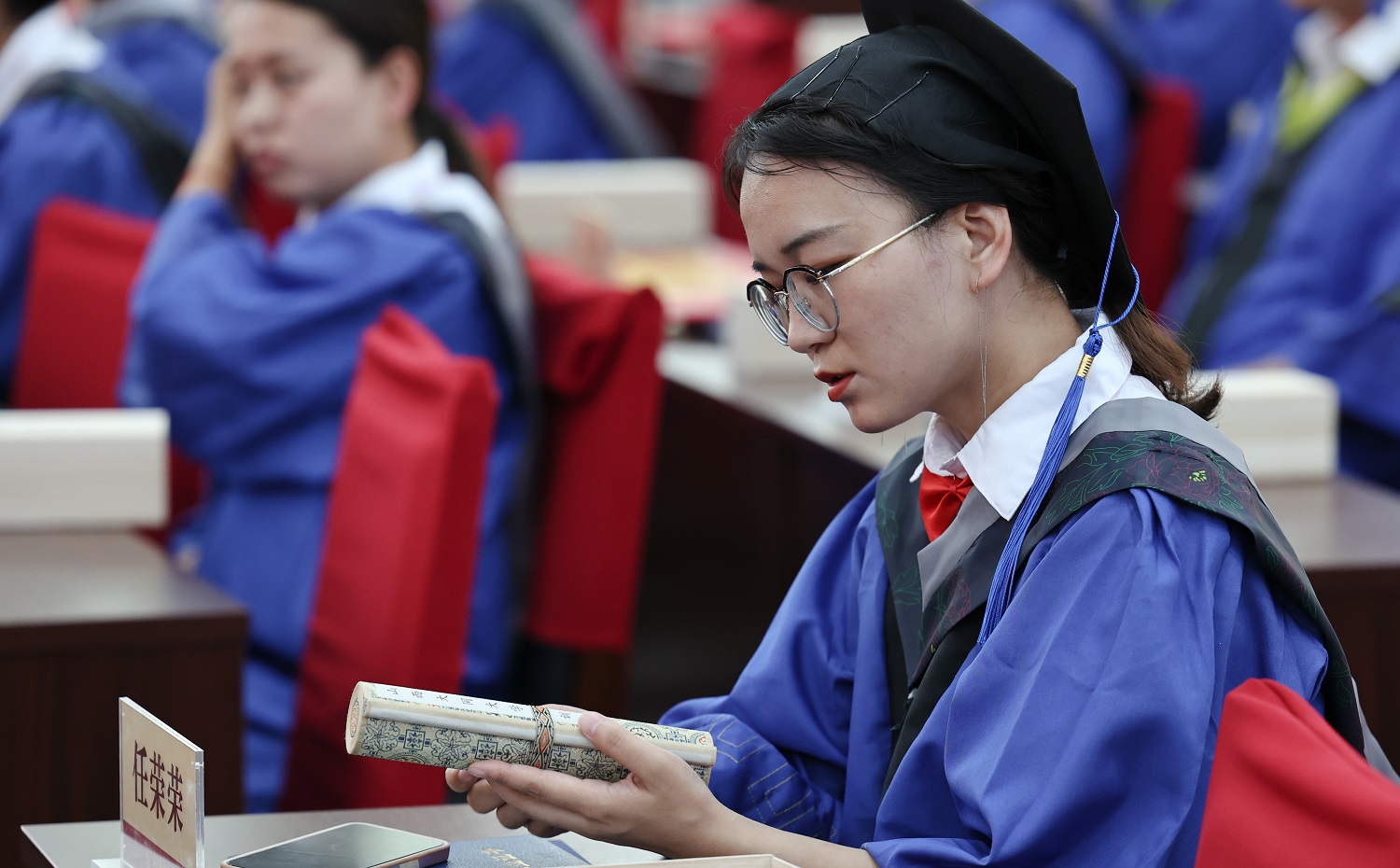 毕业典礼在庄严的《中华人民共和国国歌》声中拉开帷幕。