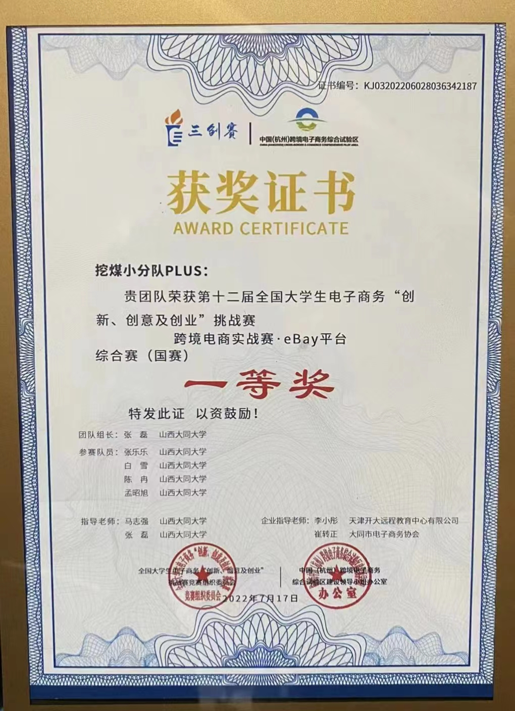 7月17日,第十二届全国大学生电子商务“创新、创意及创业”(简称“三创赛”)挑战赛综合赛在杭州桐庐县落下帷幕。今年会煤炭工程学院“挖煤小分队PLUS”团队继在2021ebay全国跨境电商创新创业大赛中取得全国“二等奖”,华北赛区“一等奖”后,又在第十二届全国大学生电子商务“创新、创意及创业”挑战赛综合赛中荣获“一等奖”、“最佳创意奖”。