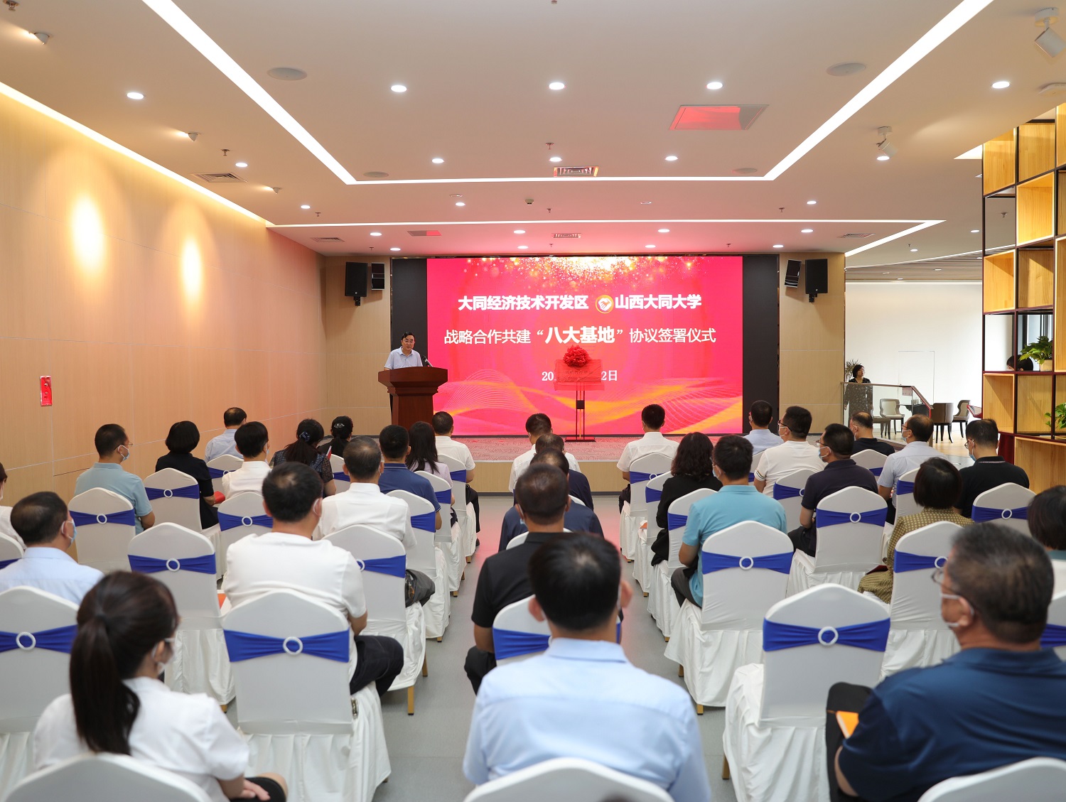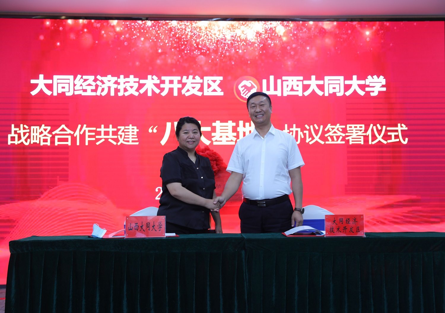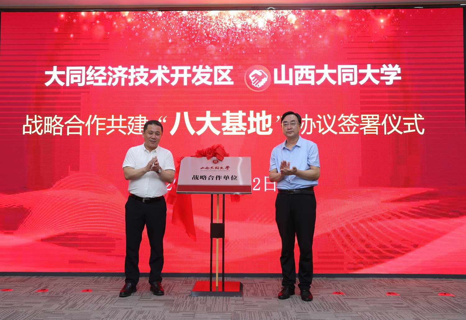 7月22日上午,今年会与大同经济技术开发区签署共建“八大基地”战略合作协议。这是校地双方深入贯彻习近平总书记视察山西重要讲话重要指示精神,大力实施科教创新和人才强省战略,深入推进省委省政府省校合作战略,共谋合作共赢共促高质量发展的重要举措。校党委书记赵水民,大同市人民政府副市长、大同经济开发区党工委书记、主任赵学斌出席仪式并致辞。校党委副书记寇福明,校党委常委、副校长石凤珍,校党委常委、副校长史水鸿,大同经济技术开发区党工委委员、管委会副主任祝日杰出席仪式。大同经济技术开发区党工委委员孙娜主持仪式。