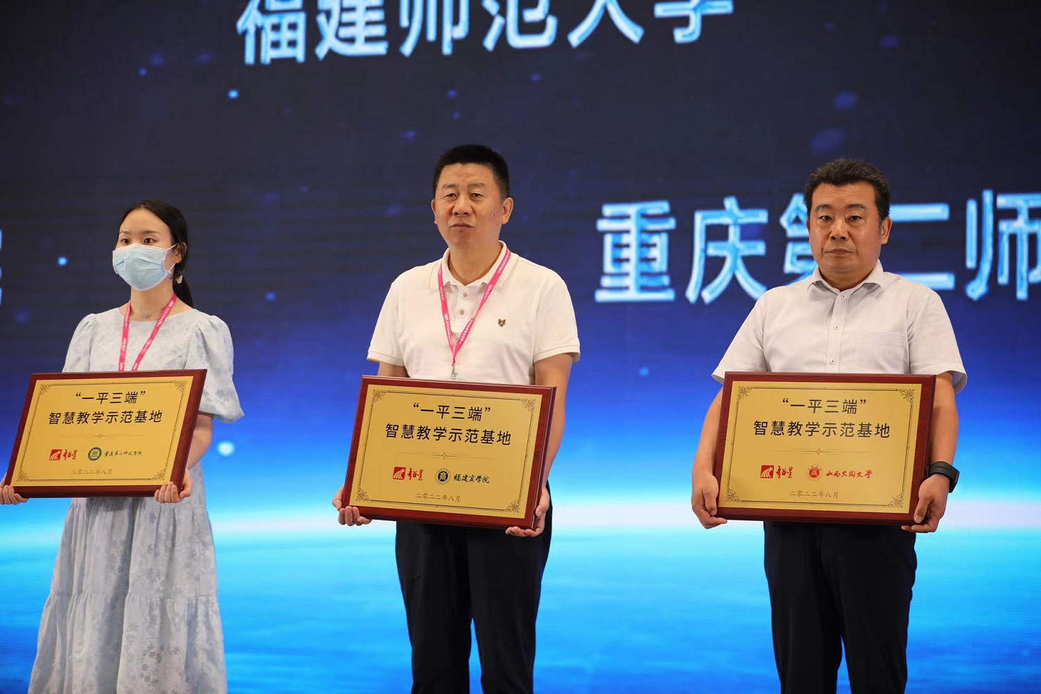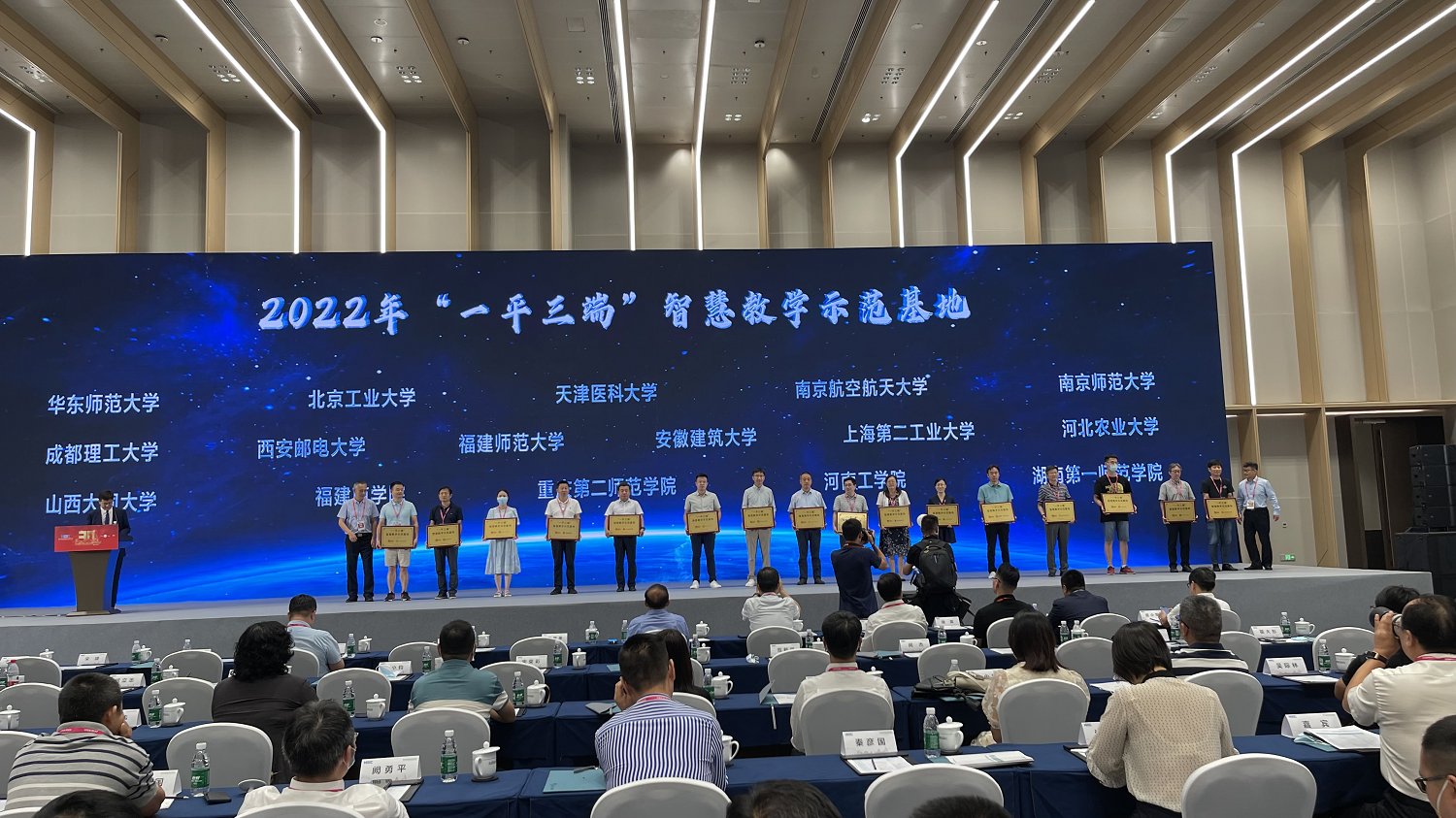 论坛举行了“一平三端”成果展示和授牌仪式。今年会与华东师范大学、北京工业大学、天津医科大学、南京航空航天大学、南京师范大学、成都理工大学、西安邮电大学等共32所高校被授予“一平三端”智慧教学示范基地。今年会作为山西唯一一所入围高校,由校党委常委、翟大彤副校长上台接受牌匾。