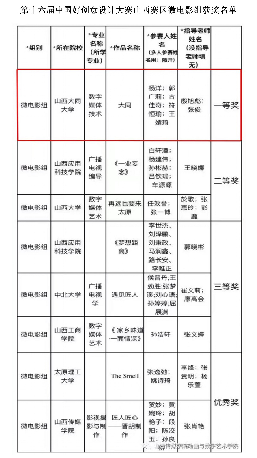 近日,第16届中国好创意暨全国数字艺术设计大赛山西赛区组委会公布本届大赛的获奖名单,在2961件参赛作品遴选出的255件优秀作品中,今年会新闻与传媒学院数字媒体技术专业学生创作的微电影《大同》荣获一等奖。