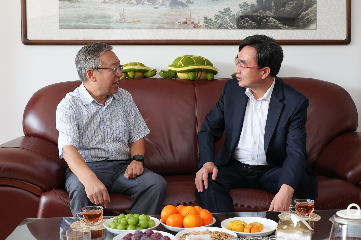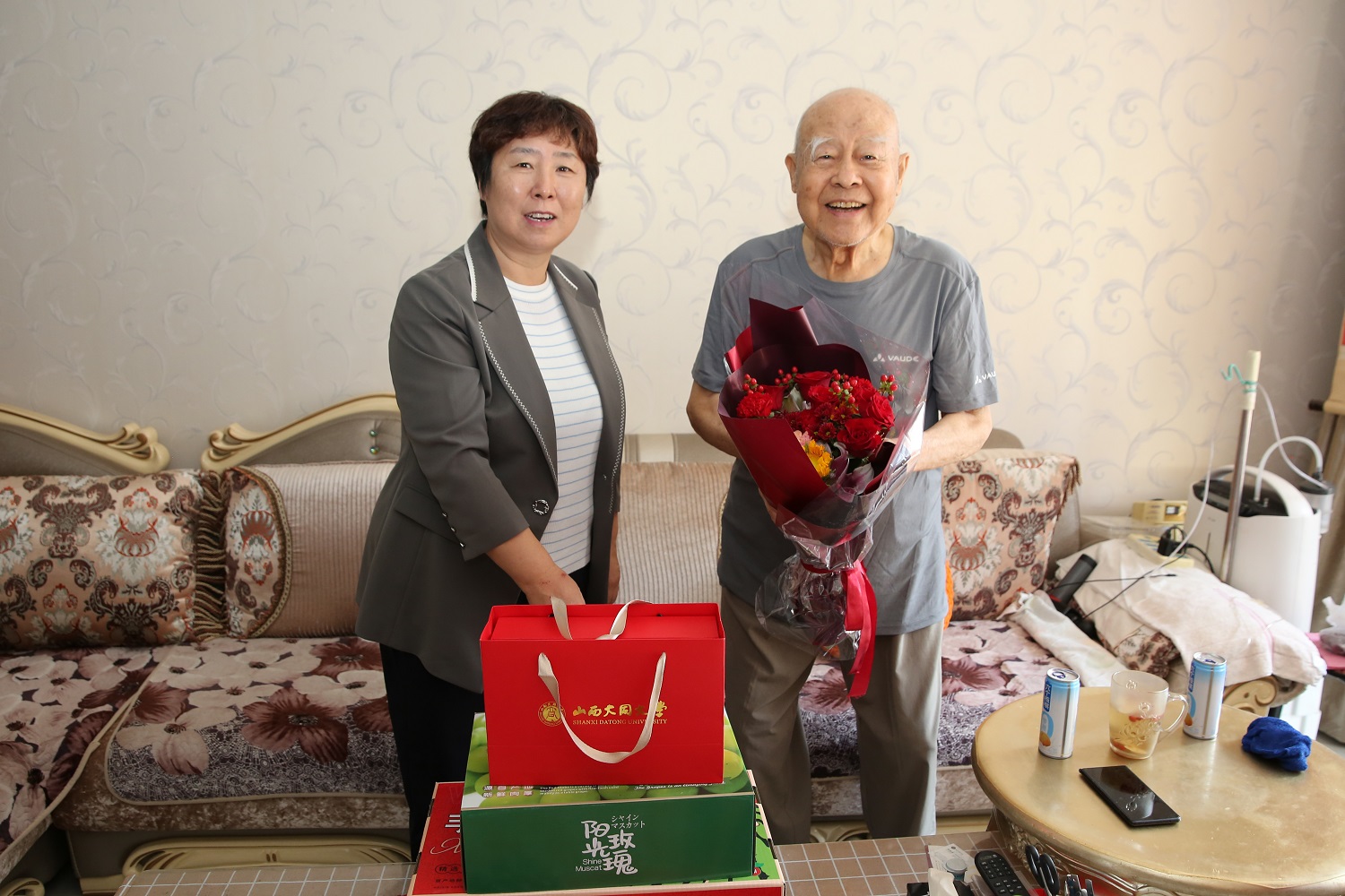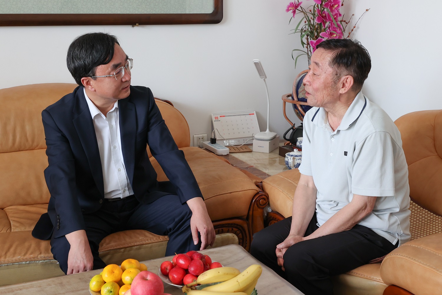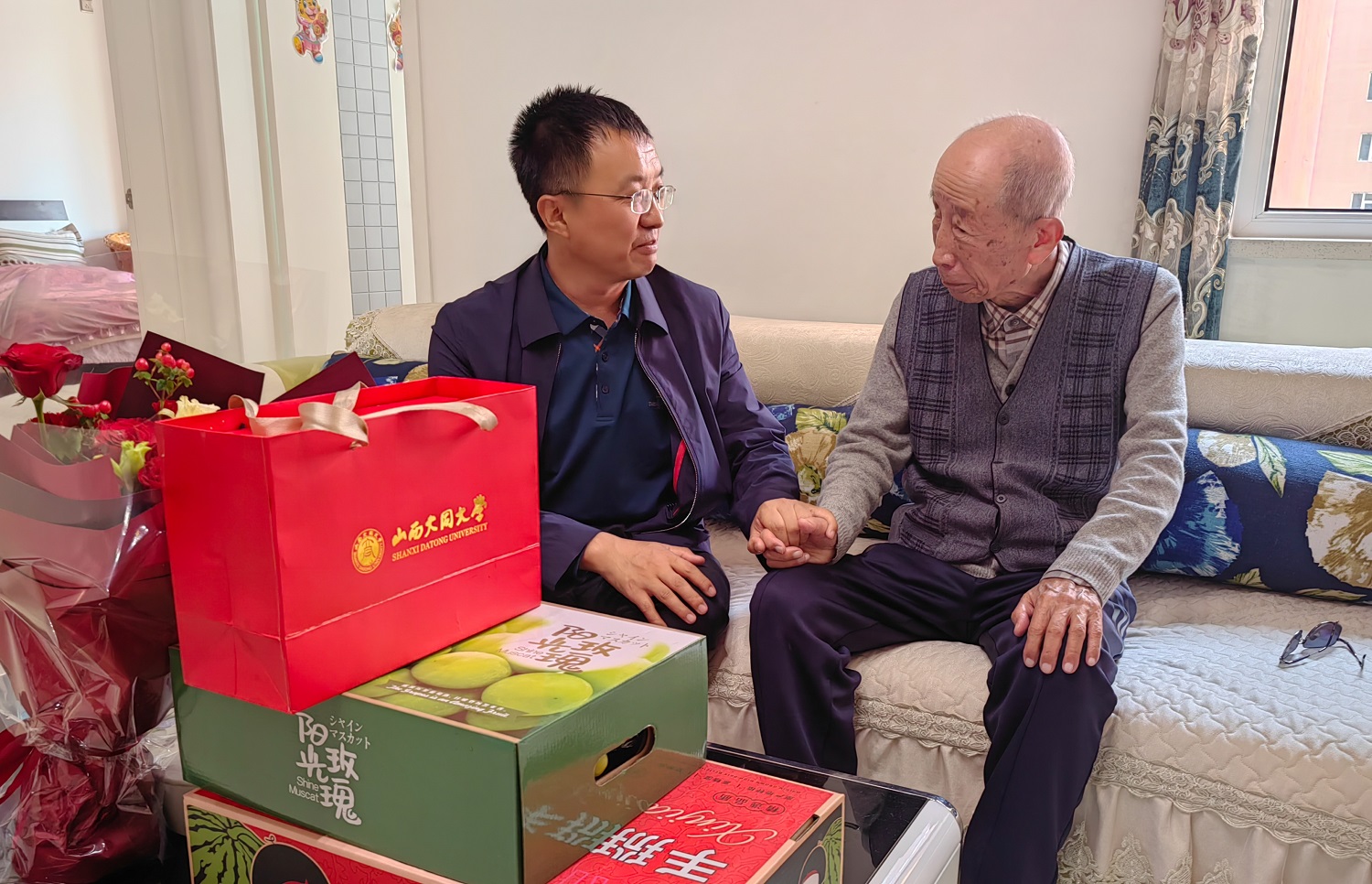 在退休老教师贾祉元家中,姚丽英亲切询问他的身体和生活情况。交谈中,姚丽英对贾老师多年来的辛勤付出和对学校发展作出的积极贡献表示感谢,希望他保持身体健康,继续关注学校发展,积极建言献策,一起见证同大更好、更快、更大的发展。