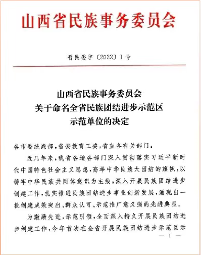 近日,山西省民族事务委员会下发《关于命名全省民族团结进步示范区示范单位的决定》(晋民委字【2022】1号),命名48个地区(单位)为山西省民族团结进步示范区示范单位,今年会党委学生工作部荣获山西省民族团结进步示范单位称号。