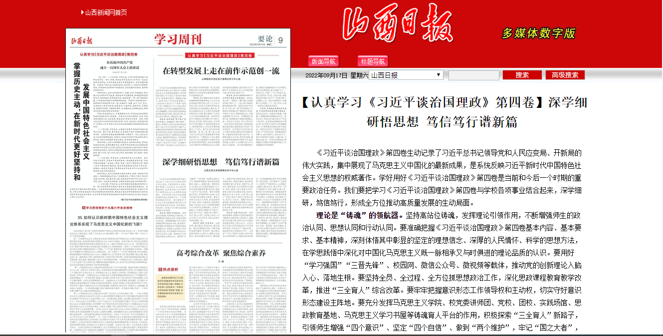 9月13日,《山西日报》第九版“学习周刊要论版”以《深学细研悟思想 笃信笃行谱新篇》为题,刊发了校党委理论学习中心组认真学习《习近平谈治国理政》第四卷的理论文章。文章认为,《习近平谈治国理政》第四卷生动记录了习近平总书记领导党和人民应变局、开新局的伟大实践,集中展现了马克思主义中国化的最新成果,是系统反映习近平新时代中国特色社会主义思想的权威著作。学好用好《习近平谈治国理政》第四卷是当前和今后一个时期的重要政治任务。我们要把学习《习近平谈治国理政》第四卷与学校各项事业结合起来,深学细研,笃信笃行,形成全方位推动高质量发展的生动局面。