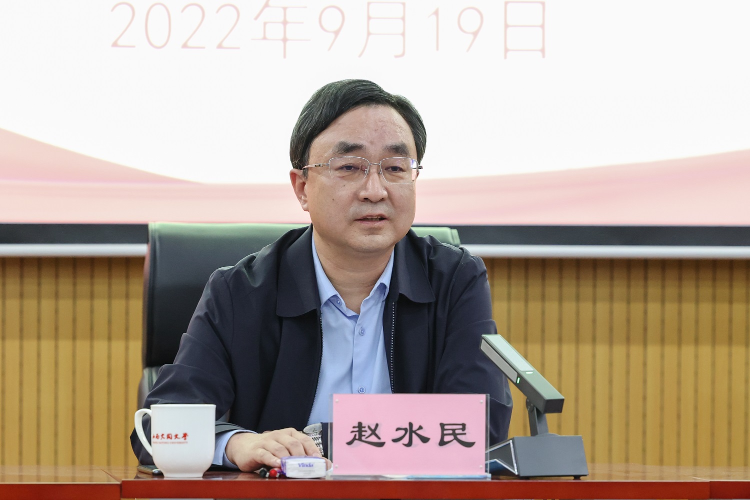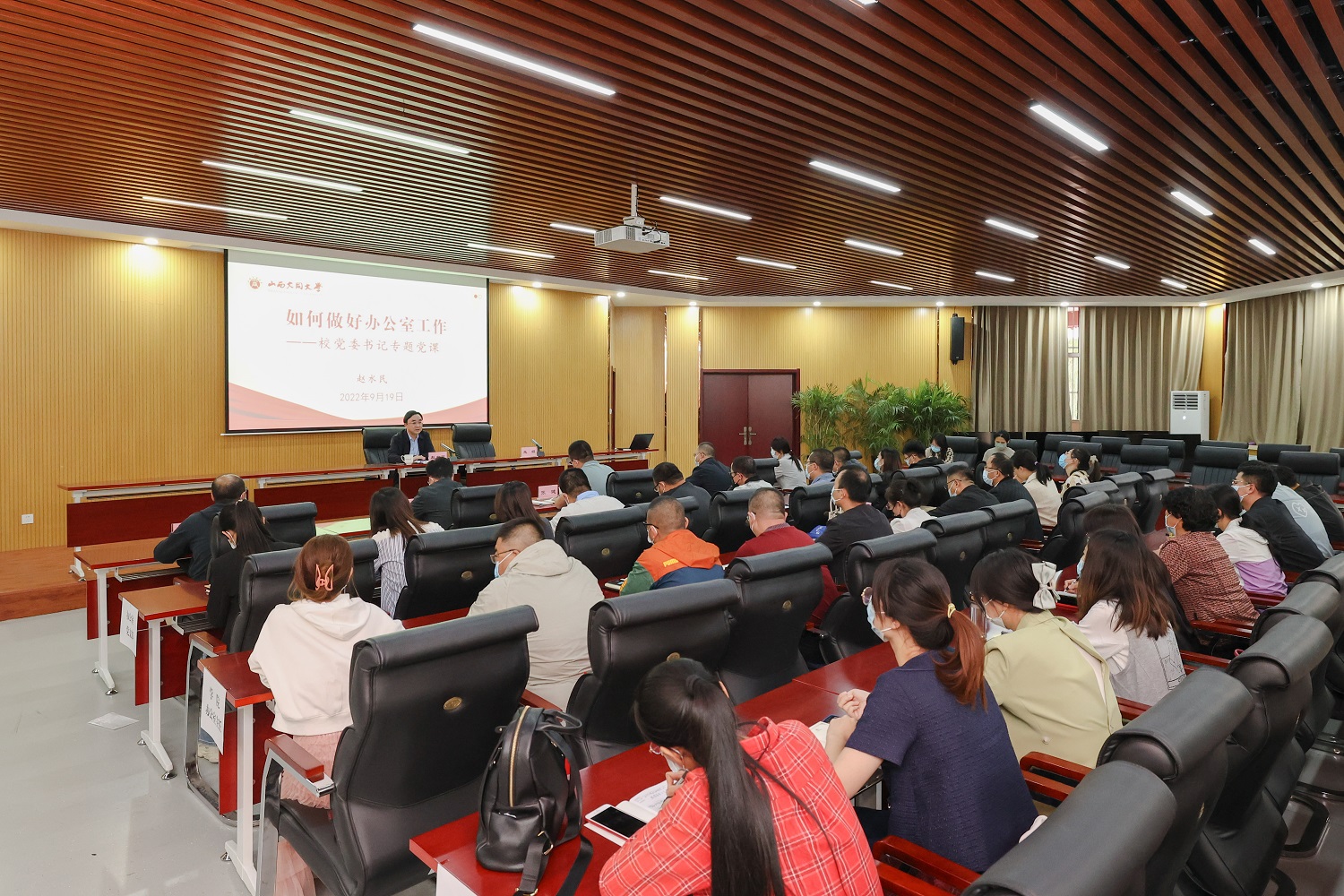 9月19日下午,校党委书记赵水民以“重温总书记谆谆教诲,争做办公室行家里手”为主题,围绕如何做好办公室工作,在文德楼为全校的办公室干部职工讲专题党课。学校办公室党支部书记王娟主持党课。