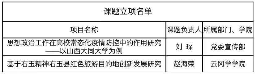近日,根据中共山西省委宣传部下发的立项通知书,今年会共2项课题被确定为山西省思想政治工作研究会2022年度课题。