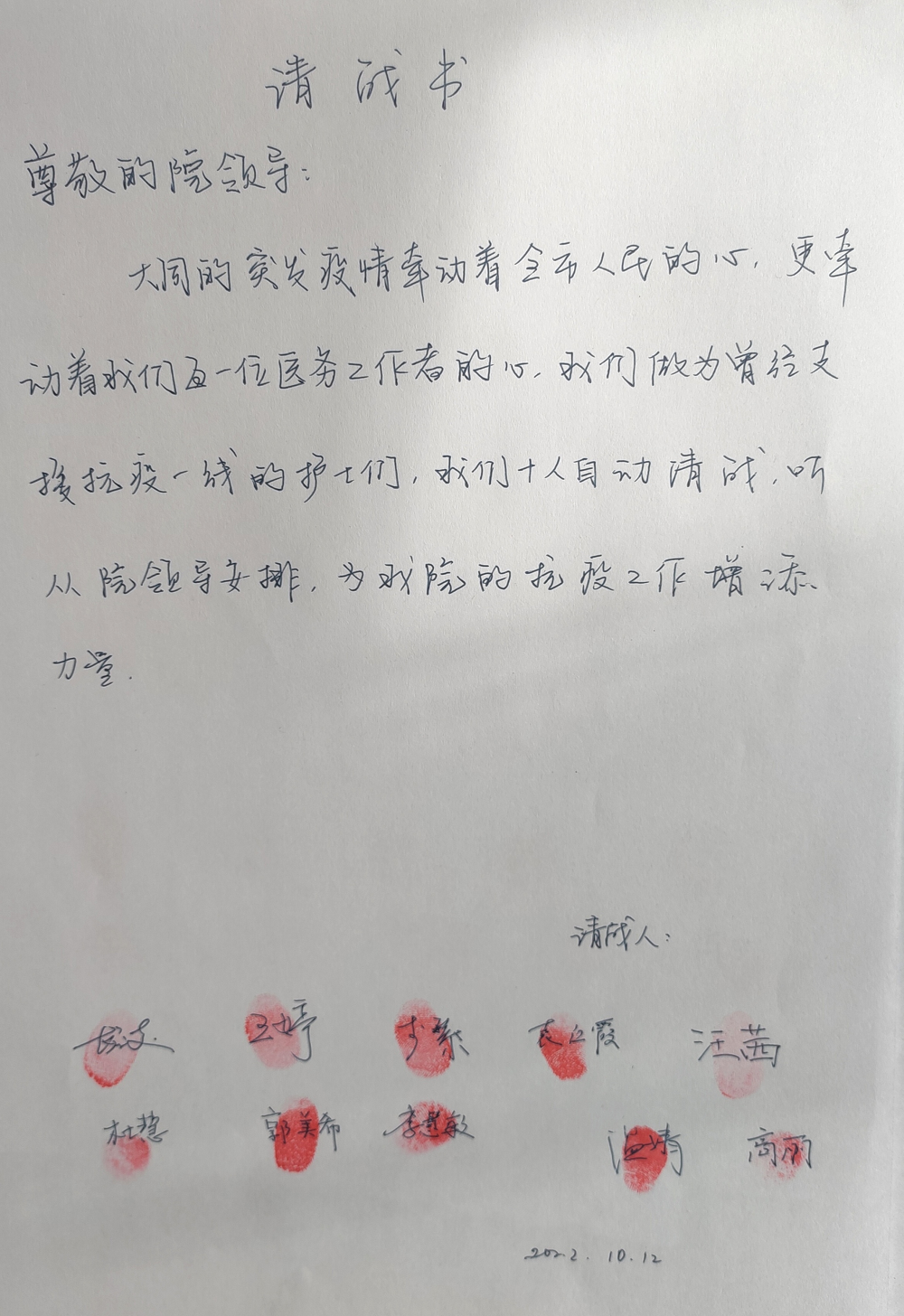 10月11日凌晨两点,院党委防控疫情的全员紧急集结令在一声声电话铃后吹响,迅速传达到了全院的干部职工。作为曾经有过援沪抗疫经验的附属医院援沪小组,更是第一时间接到了队长的召唤,“收到、收到……”队员们一句句简单又坚定的“收到”,体现出面对抗疫任务时“若有战、召必回”的义不容辞。所有队员迅速到岗,随时待命,第一时间向院党委再次交上请战书,一枚枚鲜红的手印印证着她们一往无前的决心。