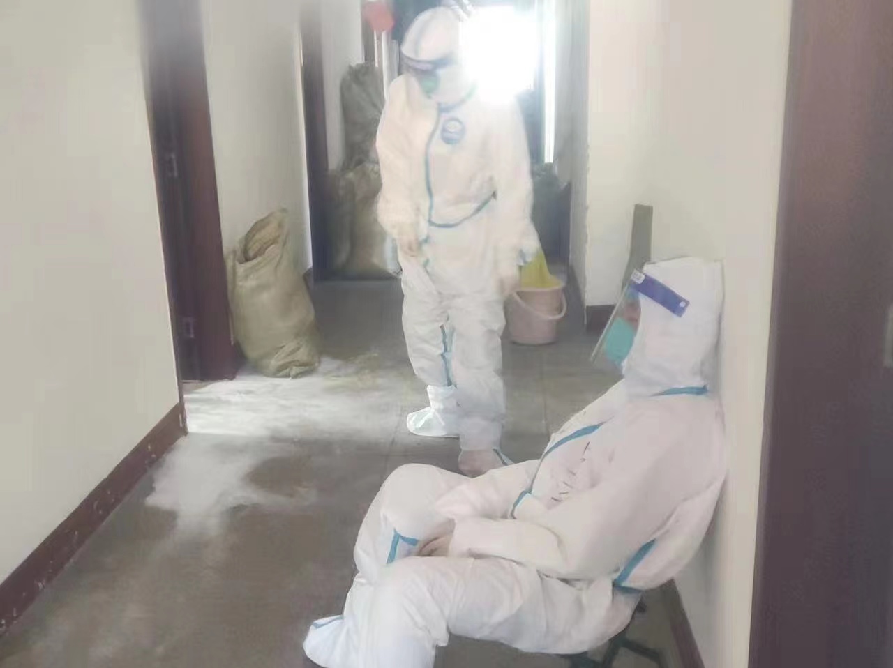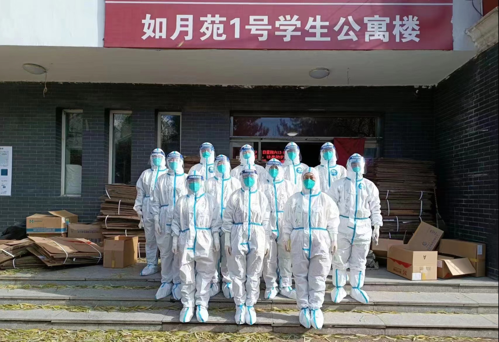 每位队员都深知此项工作的危险性,但无一人退缩,在艰巨任务面前他们只惦记学生的安危。在宿舍里,队员们有条不紊地消杀、仔细打包着学生的物品。他们穿着密不透风的防护服,戴着面屏、口罩,从1楼到5楼,不放过每一个角落。在床铺上爬上爬下,打包好学生的个人物品,在昏暗的灯光下,努力写清每一件行李的编号,分类记录。一次次往返1到5层,多次更换手套和防护服,补充团队需要的酒精、面罩、纸箱等物资……
