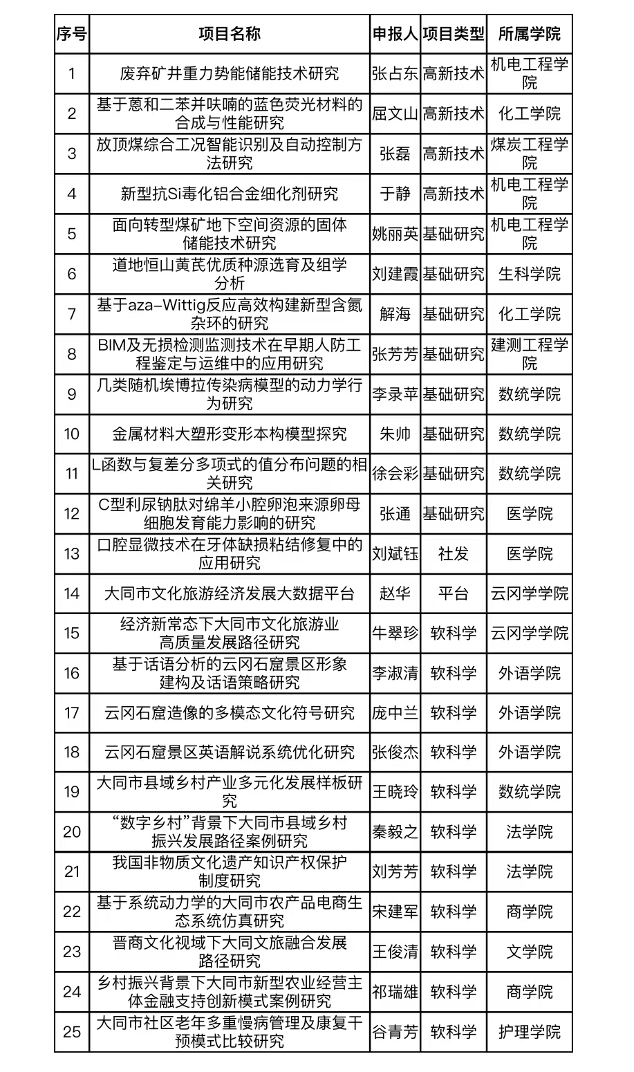 近日,大同市科学技术局公示了2022年大同市科技计划拟立项项目名单,今年会共25项获得立项,其中高新技术项目4项,基础研究项目8项,社发项目1项,软科学项目11项,平台项目1项。