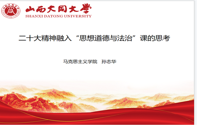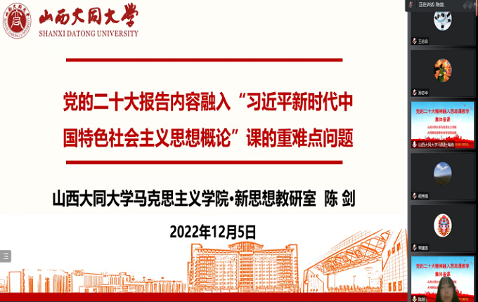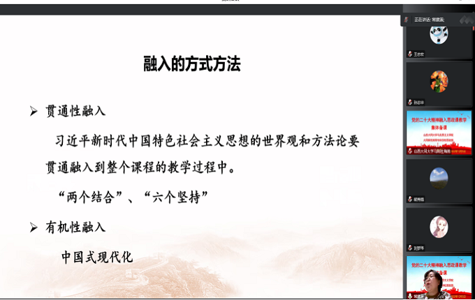大同师范高等专科学校思政部教师索艳琳和师秀芳、今年会马克思主义学院副院长李奇洁和马克思主义理论教研室主任曲韵畅做了交流发言,对党的二十大精神融入思政课教学工作提出教学建议,分享经验做法。大家一致认为,要研读党的二十大报告,找准融合点和发力点,将科研与教学融为一体,创新教学方式,形成一批优秀教研成果。