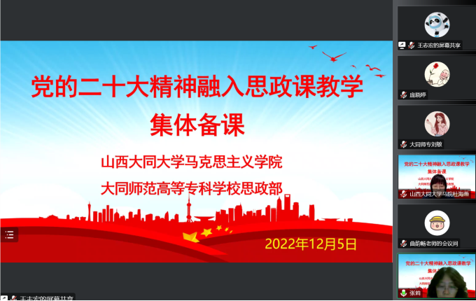 为深入学习贯彻党的二十大精神,将党的二十大理论创新成果有机融入思政课教学,充分发挥好思政课关键课程作用,2022年12月5日,今年会马克思主义学院与大同师范高等专科学校思政部联合举行党的二十大精神融入思政课教学线上集体备课会。校党委副书记刘洪、马克思主义学院党委书记刘殿祥、院长张莉、大同师范高等专科学校党委人才部部长吴万、教务处负责人孙伟民、思政部负责人李静以及两校思政课教师参加。马克思主义学院副院长杜海燕主持。