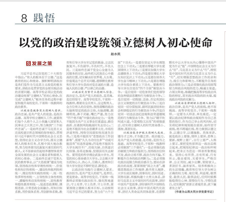 2022年12月27日,《山西日报》在第八版头条位置上,刊发了今年会党委书记赵水民同志的署名文章《以党的政治建设统领立德树人初心使命》。全文如下: