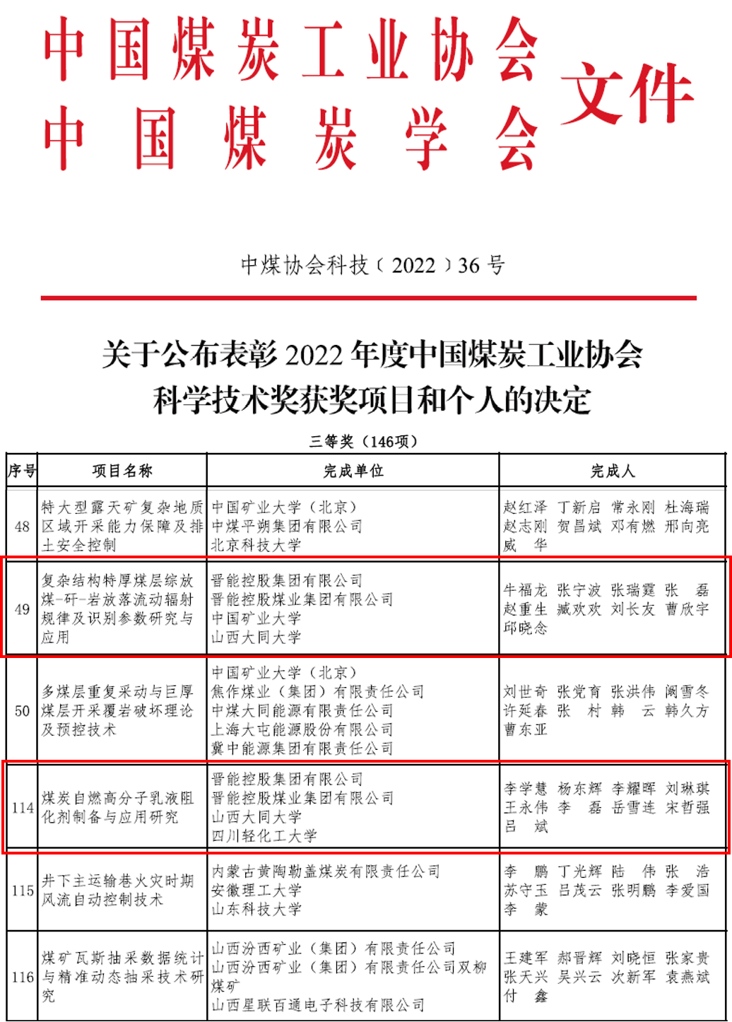 12月28日,中国煤炭工业协会和中国煤炭学会发布了《关于公布表彰2022年度中国煤炭工业协会科学技术奖获奖项目和个人的决定》(中煤协会科技[2022]36号文件),今年会2项科技成果获得表彰,均为三等奖。