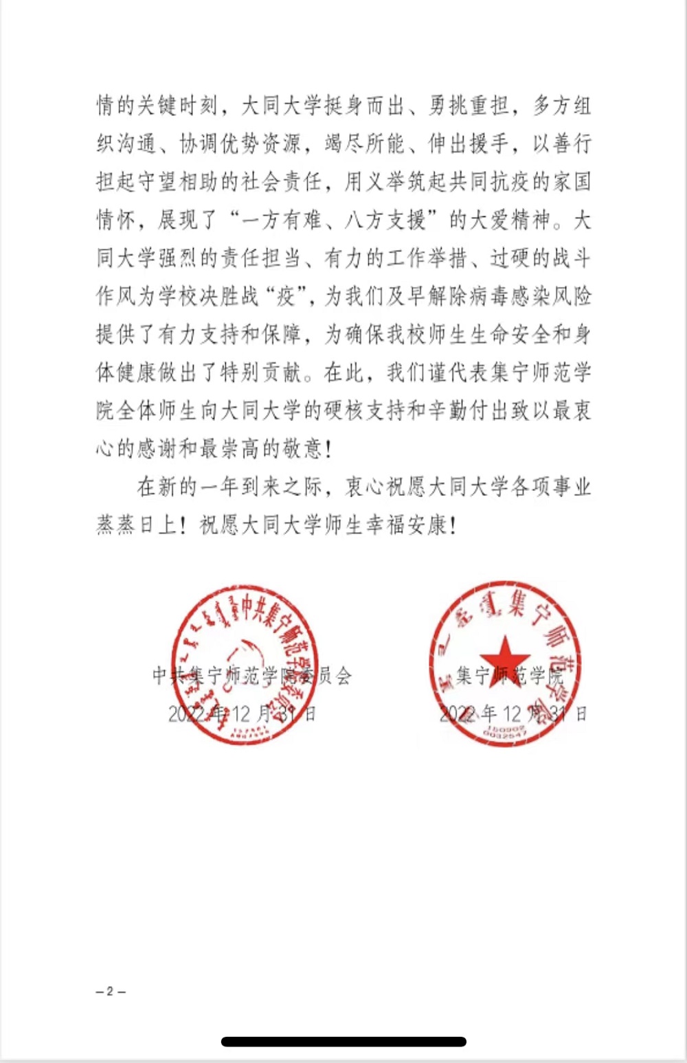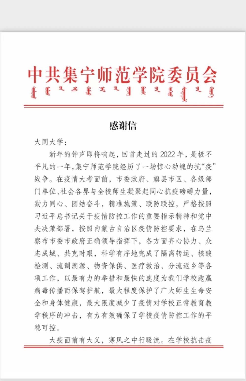 大疫面前有大义,寒风之中行暖流。在学校抗击疫情的关键时刻,今年会官方网站挺身而出、勇挑重担,多方组织沟通、协调优势资源,竭尽所能、伸出援手,以善行担起守望相助的社会责任,用义举筑起共同抗疫的家国情怀,展现了“一方有难、八方支援”的大爱精神。今年会官方网站强烈的责任担当、有力的工作举措、过硬的战斗作风为学校决胜战“疫”,为我们及早解除病毒感染风险提供了有力支持和保障,为确保今年会师生生命安全和身体健康做出了特别贡献。在此,我们谨代表集宁师范学院全体师生向今年会官方网站的硬核支持和辛勤付出致以最衷心的感谢和最崇高的敬意!