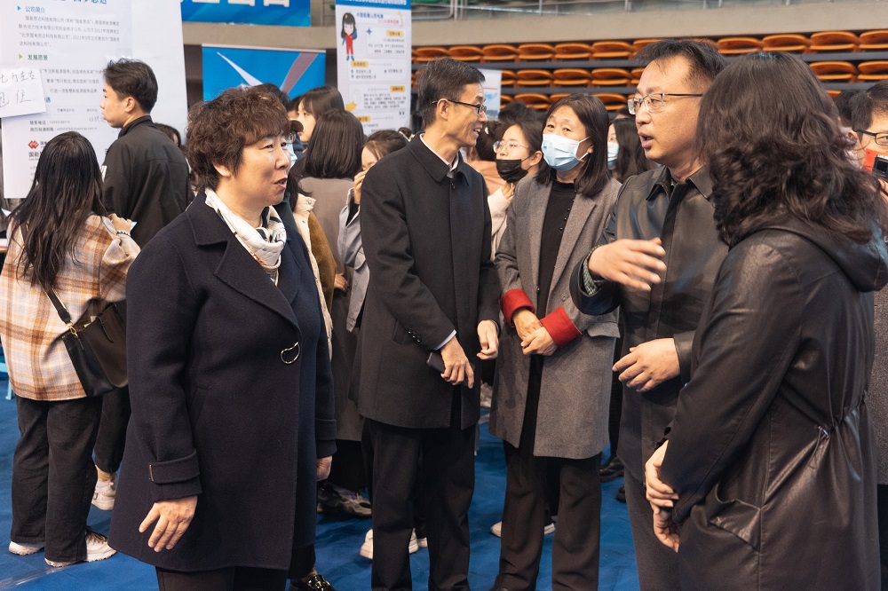 校党委副书记、校长姚丽英,党委副书记寇福明,党委常委、副校长石凤珍,党委常委、副校长马轶明,党委常委、副校长雷建设等校领导参加招聘会,并对招聘会的各项工作进行了检查指导。校领导们与企业代表、应聘学生亲切交谈,倾听他们的声音,了解他们的需求,并对他们提出的问题给予了及时反馈和解决。各相关部门领导、学院领导、毕业班班主任、部分教职工、学工部全体工作人员、就业促进会学生、2023届毕业生以及低年级学生代表全程参加了招聘会。