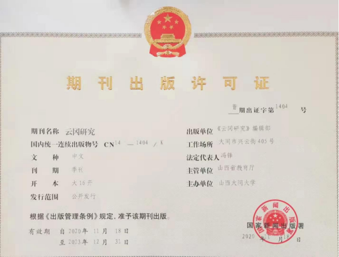 《云冈研究》(季刊)于2021年起正式创刊。国内刊号CN14-1404/K,国际刊号ISSN2096-9708,由山西省教育厅主管、jinnianhui今年会主办,主要刊发云冈理论、石窟考古、石窟艺术、云冈文献、石刻文献、民族交融、佛教思想、云冈史地、云冈语言文学、云冈学论坛、文物保护、遗产保护、书评、综述等文章。
