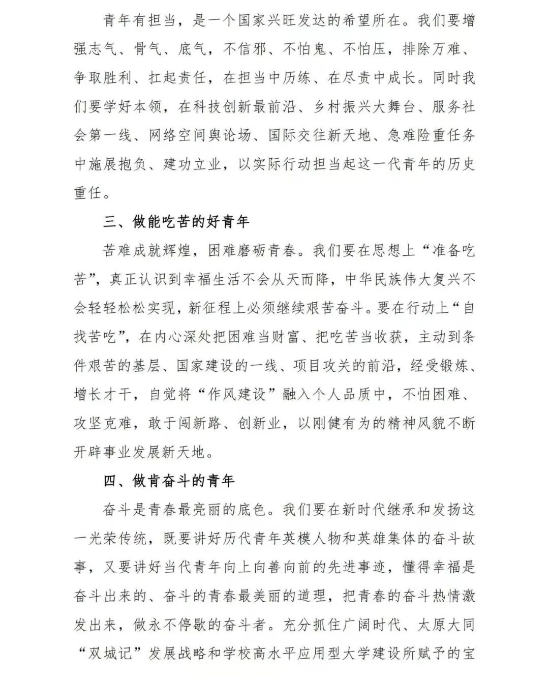 校团委书记刘斌焰指出,习近平总书记给中国农业大学科技小院的回信,深深鼓舞了奋斗中的当代青年,希望同大的青年学子牢记习近平总书记对青年的“爱国、励志、求真、力行”的“四点要求”,“坚定理想信念、练就过硬本领、勇于创新创造、矢志艰苦奋斗、锤炼高尚品格”的“五点希望”,“勤学、修德、明辨、笃实”的“八字真经”,“志存高远、德才并重、情理兼修、勇于开拓”的“十六字诀”,牢固树立马克思主义坚定信仰和实现中华民族伟大复兴的强大信心,努力将自己锻造成为国家栋梁之才,更好地肩负起民族复兴的时代重任。