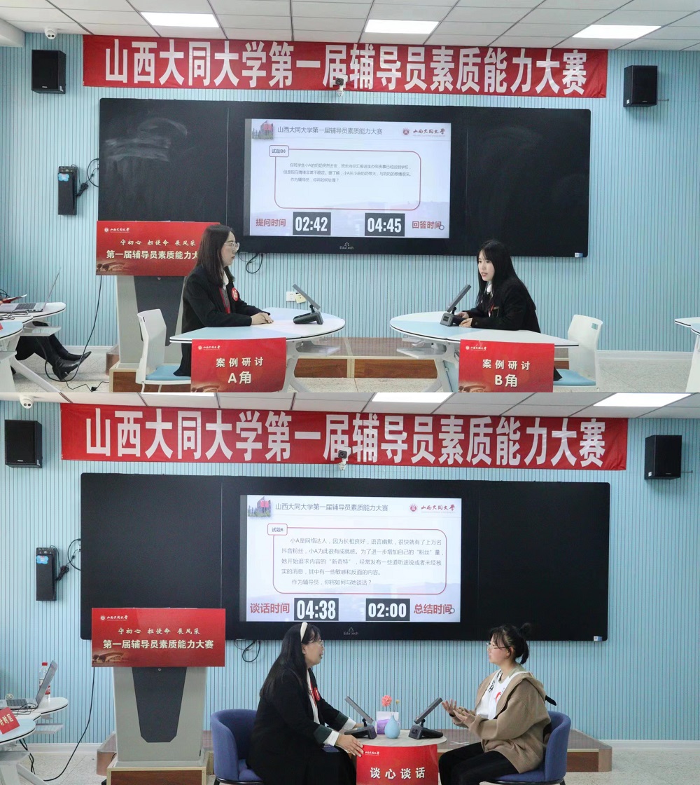 决赛包括案例研讨和谈心谈话两个环节。案例研讨环节主要考察辅导员综合运用理论分析问题、研判问题、解决问题的能力。选手在赛前抽取AB角签位和案例题目。比赛以“我提问,你回答”的方式开展,由AB选手围绕案例共同辨析原因、研讨对策、总结规律。10组选手以饱满的精神状态和流畅的语言表达,在案例研讨中剖析问题本质,探求解决思路,提出实施办法,彰显育人理念,充分展示了今年会辅导员扎实的职业功底。