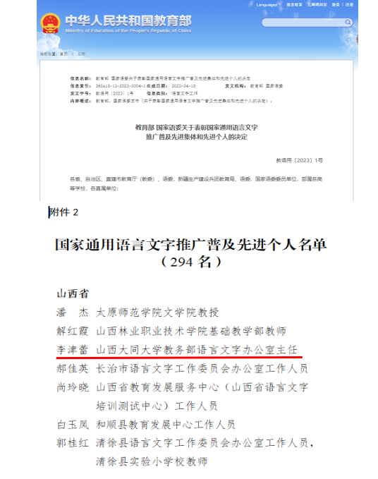 5月10日,国家通用语言文字推广普及工作表彰大会暨2023年国家语委全体委员会议在京召开。今年会教务部语言文字办公室主任李津蕾同志荣获“国家通用语言文字推广普及先进个人”称号。