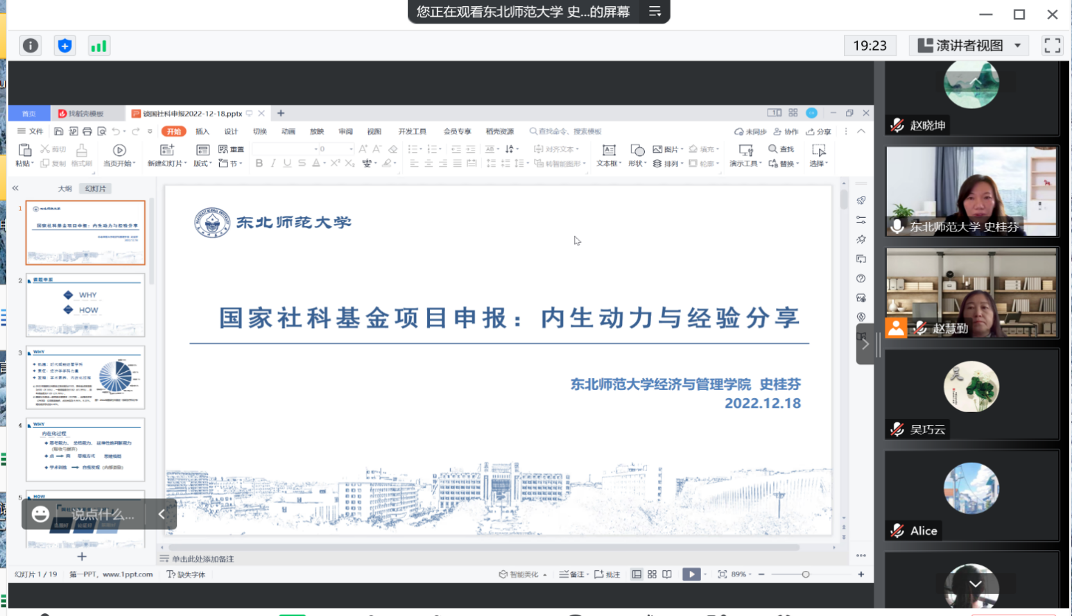 12月8日下午,人文社科部邀请东北师范大学经济与管理学院博士生导师史桂芬教授在线举行2023年度国家社科基金项目申报经验分享交流会。会议由赵慧勤部长主持,40余名教师参加了此次线上会议。