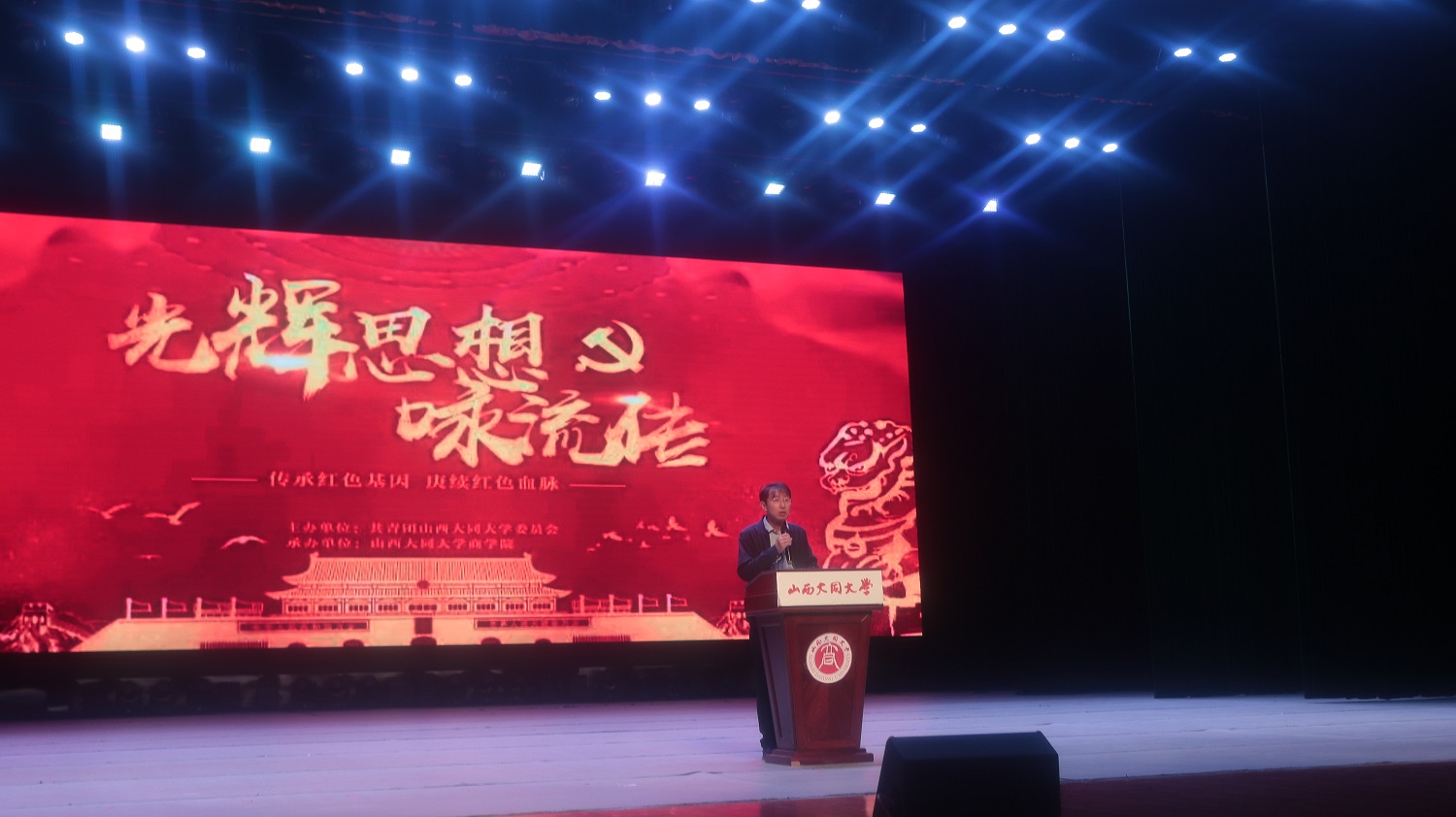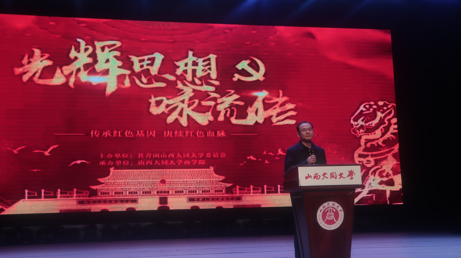 刘斌焰致辞,他代表学校对此次比赛的举办表示热烈祝贺,同时向为筹备此次活动而付出辛勤劳动的老师们、同学们表示衷心感谢。他指出,本届朗诵比赛以革命为主题,紧扣党史学习教育,力求全面展现百年大党的青春风华。在培养同学们爱好与特长的同时,充分展现同大学子蓬勃的精神面貌和矢志不渝的家国情怀,让青春在为祖国、为民族、为人民、为人类的不懈奋斗中绽放绚丽之花。随后,武全宣布jinnianhui今年会第三届“光辉思想咏流传”经典诵演比赛决赛正式开始。