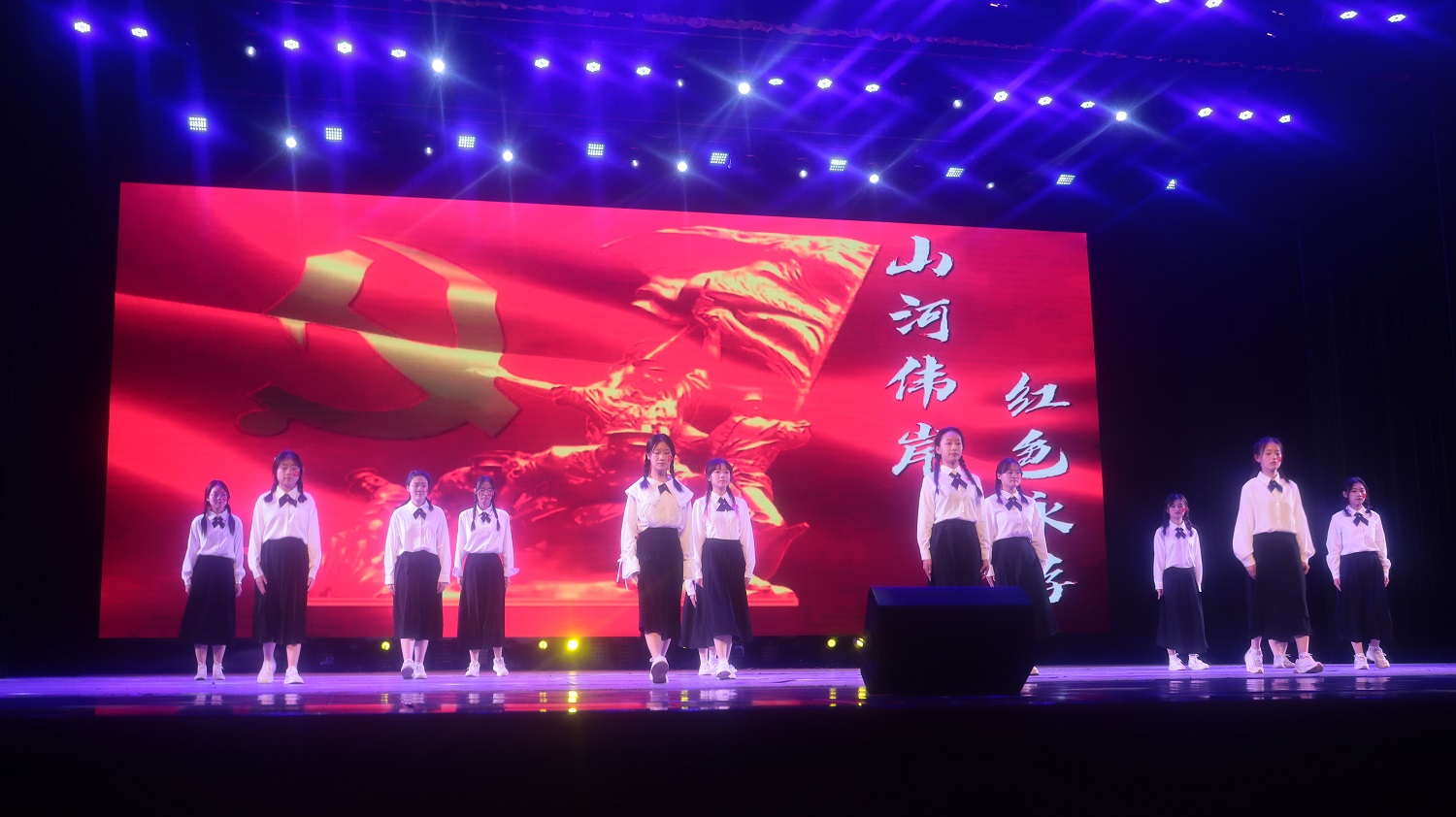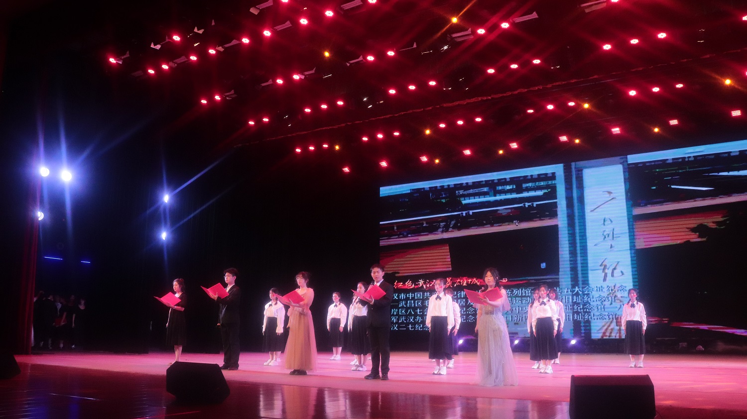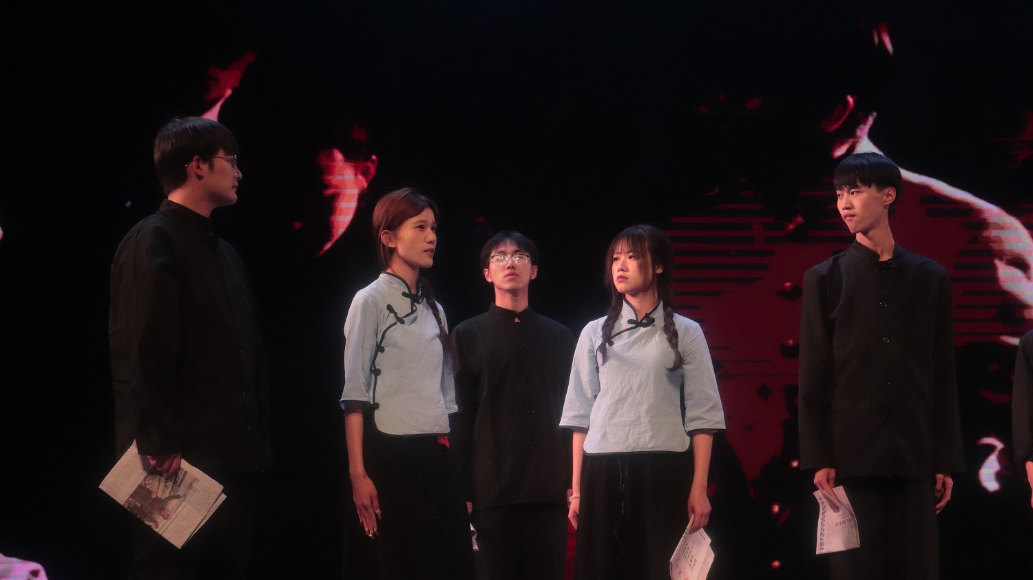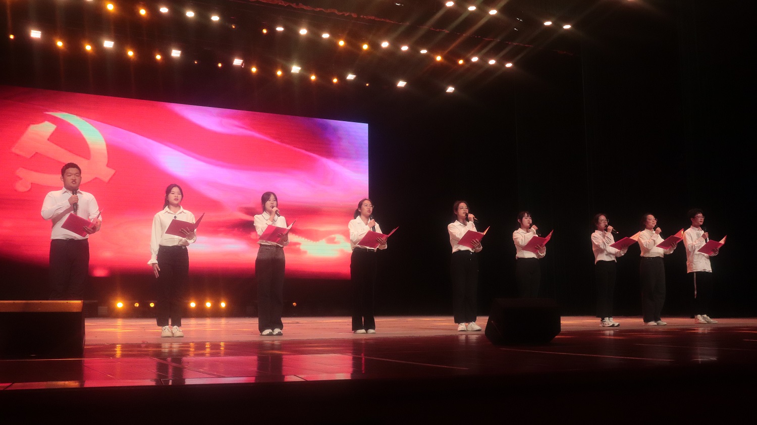 文学院的《中国红》、化学与化工学院的《红船,从南湖起航》以及商学院的《青年志》等朗诵节目带领我们穿梭历史的云烟,追寻火红的足迹,让我们看到一代又一代优秀青年紧跟党的步伐,始终站在时代的峰顶浪尖。青春的火焰蓬勃燃烧,只因心底对祖国至浓至烈的爱。医学院的话剧表演《续》、新闻与传媒学院的配乐朗诵《请铭记,雾重庆》、商学院的合唱《光的方向》用不同的表演形式以情入声,用满腔热血浸润脚下的土地,中华儿女终将靠近光、追随光、成为光、散发光。
