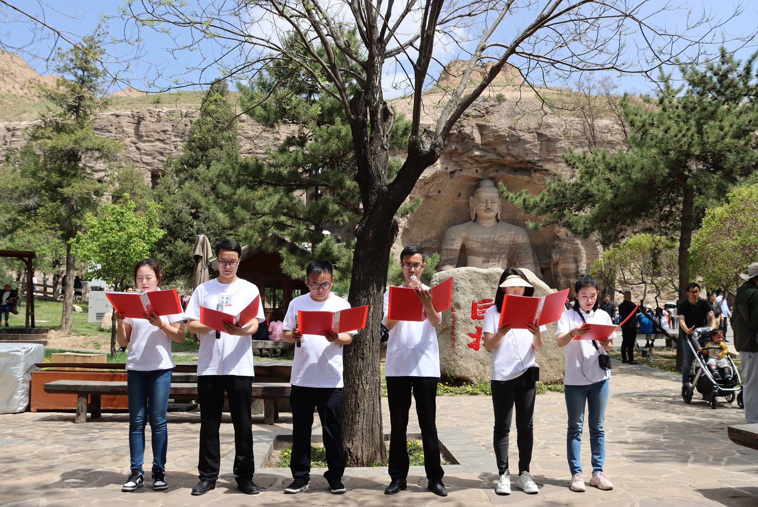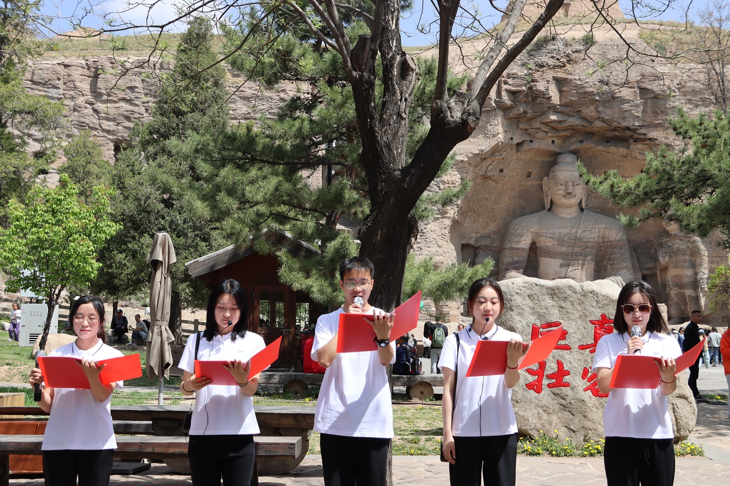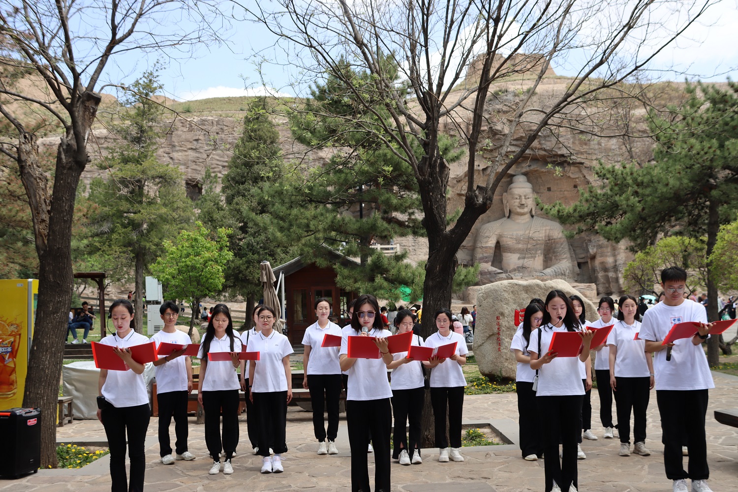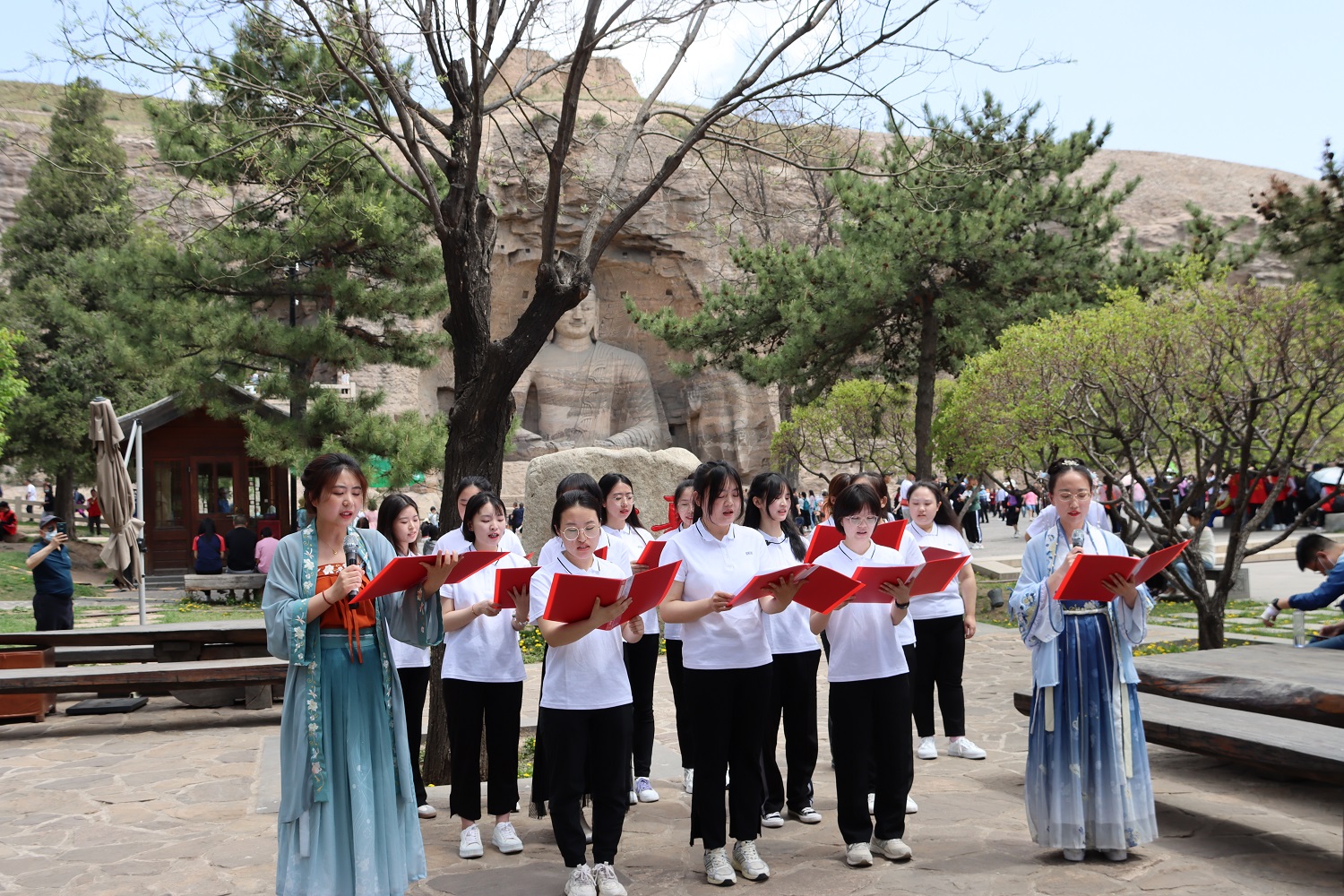 在全校深入开展学习贯彻习近平新时代中国特色社会主义思想主题教育之际,5月14日,党委研究生工作部和文学院在云冈石窟成功举办“石破奏清音,雅声诵云冈”研究生云冈石窟主题研学实践活动。活动旨在加强研究生思想政治引领,突出中国语言文学学科研究生培养专业特色,引导研究生主动参与主题教育,深入学习贯彻习近平总书记视察云冈石窟重要指示精神,增进研究生了解、传承、研究、弘扬云冈文化的使命担当。党委研究生工作部部长白昕,副部长张继红、苏新武及部门其他人员,文学院副院长刘世明、部分研究生导师代表以及研究生代表共50余人参加活动。