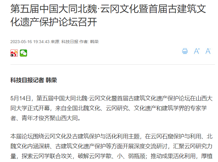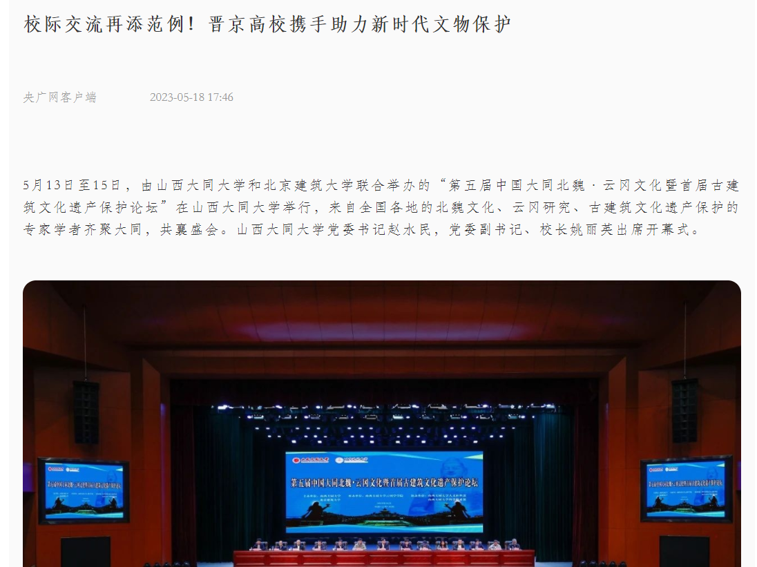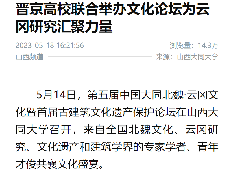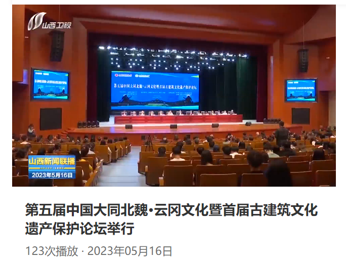5月16日,山西新闻联播播出《第五届中国大同北魏·云冈文化暨首届古建筑文化遗产保护论坛举行》,内容中提到,“专家学者们围绕珍贵的大同北魏建筑遗产、北魏中华民族共同体成因探析等主题分别作了报告,并聚焦云冈石窟保护与利用、古建筑文化遗产保护等议题进行深入交流。”