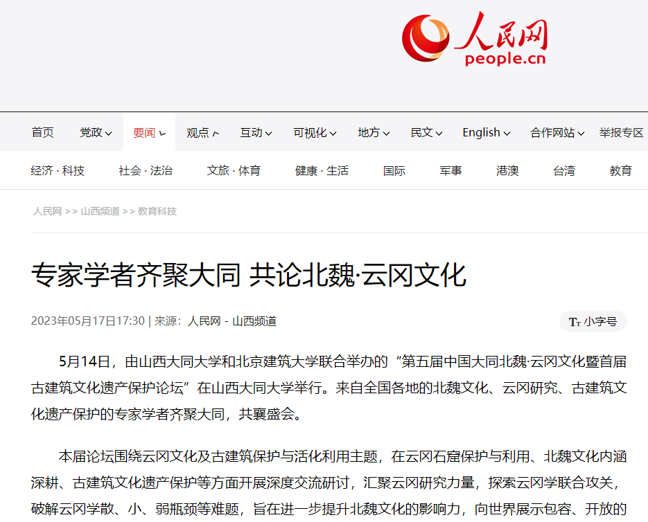 5月17日,人民网以《专家学者齐聚大同,共论北魏·云冈文化》为题报道论坛举办情况,报道中提到,“本届论坛围绕云冈文化及古建筑保护与活化利用主题,在云冈石窟保护与利用、北魏文化内涵深耕、古建筑文化遗产保护等方面开展深度交流研讨,汇聚云冈研究力量,探索云冈学联合攻关,破解云冈学散、小、弱瓶颈等难题。”