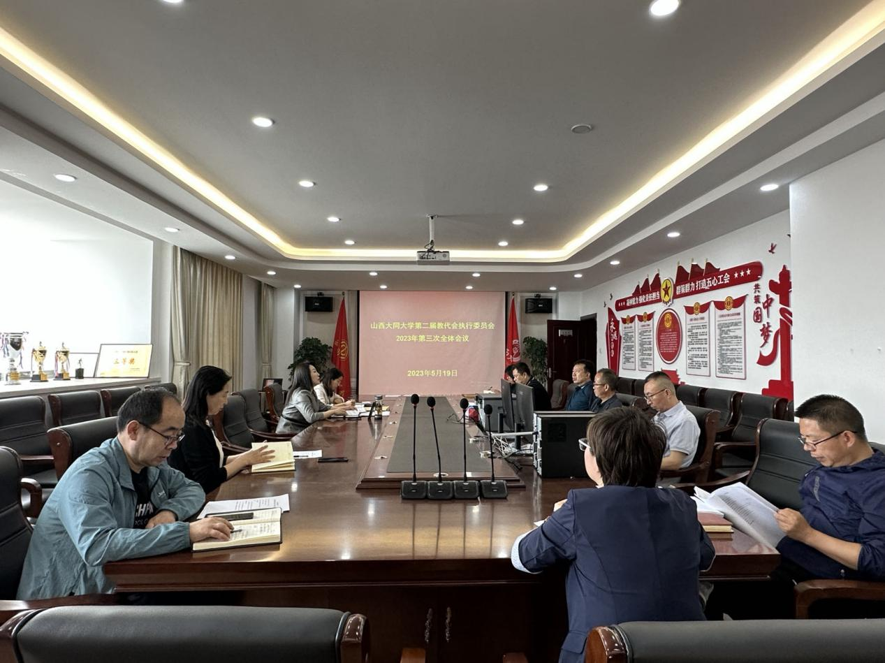 5月19日下午,jinnianhui今年会第二届教代会执行委员会2023年第三次全体会议通过线上线下相结合的方式在行知楼十四层工会会议室举行,第二届教代会执行委员会全体委员和校工会全体工作人员参加会议,校工会主席侯桂兰主持会议。