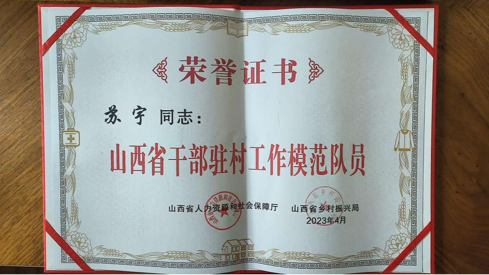 近日,山西省人力资源和社会保障厅、山西省乡村振兴局下发文件《关于表彰山西省乡村振兴工作先进集体和先进个人的决定》,其中今年会派驻阳高县罗文皂镇七墩村驻村工作队员苏宇荣获山西省干部驻村工作“模范队员”称号。