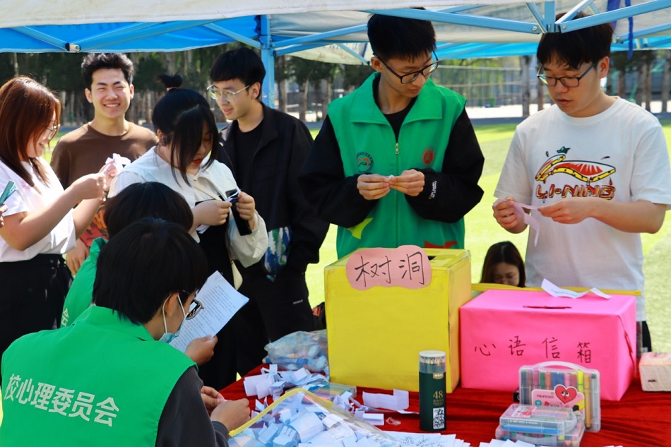 两个校区现场心理咨询均持续一天,现场咨询设立心理咨询区、心理游戏区、科普展览区、箱庭体验区和情绪收集区五个区域。在心理咨询区,由心理咨询中心的专、兼职心理咨询师以及校外知名心理咨询师,为在校师生现场解答心理困惑;在心理游戏区,师生通过多种方式,共同体验心理游戏带来的心理感受和体验,体现了团队合作,宣泄了不良情绪;在科普展览区,展示各个学院同学对于心理健康以及人生的感悟,提升同学们对心理的认知,同时展示同学们自己制作的精美手抄报,表现了同学精妙的构思;在箱庭体验区,通过体验箱庭疗法,激发同学们关注自我和自我情感的宣泄,促进对自我认识。在情绪收集区,同学们可以把自己的烦恼和对未来的希望投进“树洞箱里”,希望可以宣泄不良情绪,期许美好的心愿成真。