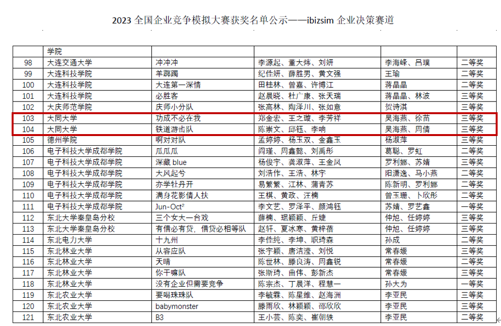 5月20日,由中国管理现代化研究会决策模拟专业委员会主办的第十四届全国企业竞争模拟大赛(本科组)正式落下帷幕,本次大赛分为校内初赛、全国复赛、全国半决赛、全国总决赛四阶段。大赛自3月7日启动以来,有来自全国381所院校共计3356支队伍报名参赛,最终今年会商学院由吴海燕、周倩、徐苗老师指导的2020级物流管理二班学生郑金宏、王之璇、李芳祥组成的“功成不必在我队”和2022级物流管理一班学生陈崇文、邱钰、李响组成的“铁道游击队”荣获全国三等奖的佳绩。