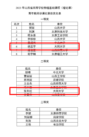 2023年山西省高等学校物理基础课程青年教师讲课比赛获奖名单(截图)