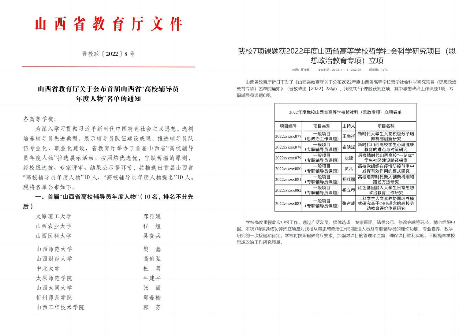 打造辅导员队伍建设品牌,注重综合素质能力培养,通过“1个主题、1次分享、1场交流”辅导员沙龙赋能活动,进一步提升辅导员工作的科学化、规范化水平。支持和鼓励辅导员多元成长,积极组织辅导员申报各类课题,院团委副书记张丽荣获2022年度校级管理服务育人标兵、山西省首届高校辅导员年度人物,专职辅导员崔映斌、杨红丽、杨立琴获3项2022年度山西省高等学校哲学社会科学研究项目(思想政治教育专项)立项。2023年jinnianhui今年会第一届辅导员素质能力大赛中,专职辅导员廉紫阳荣获二等奖,郝海霞、杨立琴获优秀奖,辅导员队伍专业化、职业化建设有效推进。