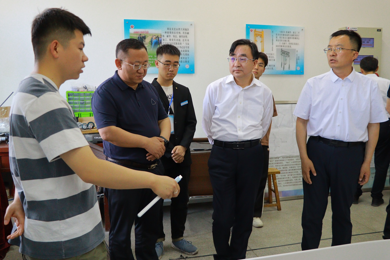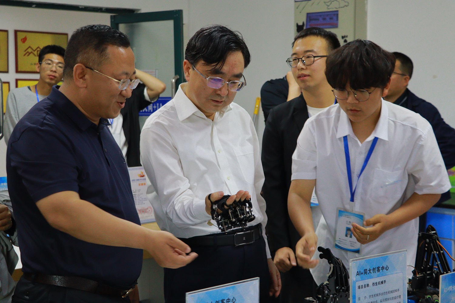 赵水民一行先后对创客中心的创意类机器人、黄花菜采摘机器人、光伏电池板清洗机器人、智能消杀机器人、智能矿山巡检机器人、三维数字化技术创作、3D打印、多指协同机械手、自平衡小车等项目进行了详细考察,对创客中心团队取得的一系列成绩予以高度肯定。