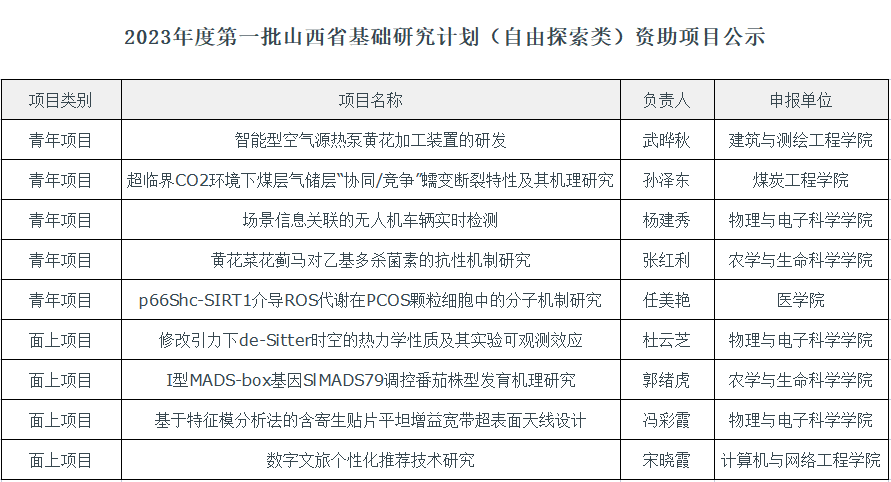 昨日,山西省科技厅对2023年度第一批山西省基础研究计划(自由探索类)资助项目予以公示,今年会共9项获得立项,其中青年5项,面上4项。