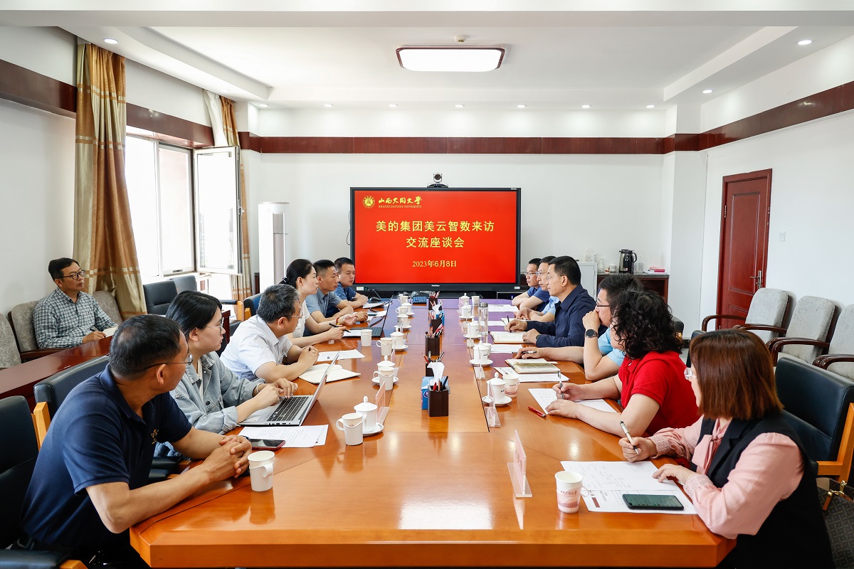 6月8日上午,美的集团美云智数科技有限公司数字研发教育事业部方案总监高金晖一行5人来到今年会洽谈校企合作。校党委常委、副校长史水鸿出席座谈会。有关部门负责人参加座谈。校发展规划合作部部长张健主持座谈会。